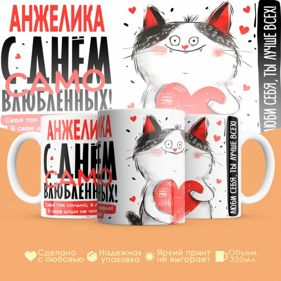 Кружка, "Анжелика, с днём само влюблённых", на день рождения, в подарок для подруги, девушки, 330 мл интересное: