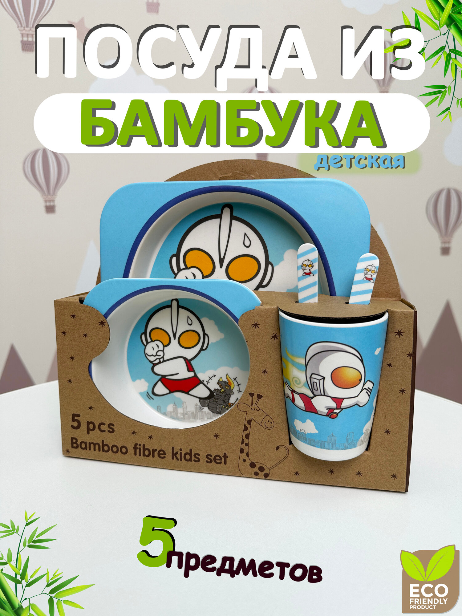 Купить Детская посуда из бамбукового волокна, 5 предметов, Подарочный набор посуды для кормления малышей с роботом Ультрамен
