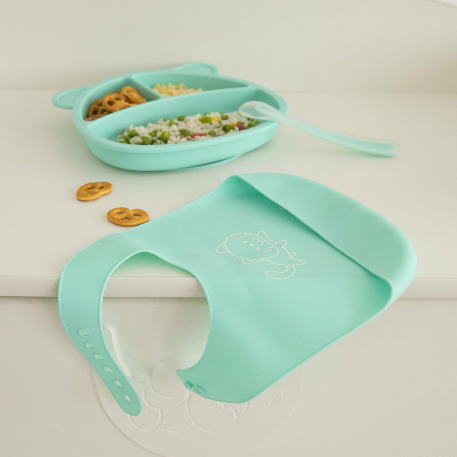 Тарелка на присоске детская силиконовая с секциями+ нагрудник + ложка для кормления малышей/ Набор детсокй посуды Baby Nice интересное: