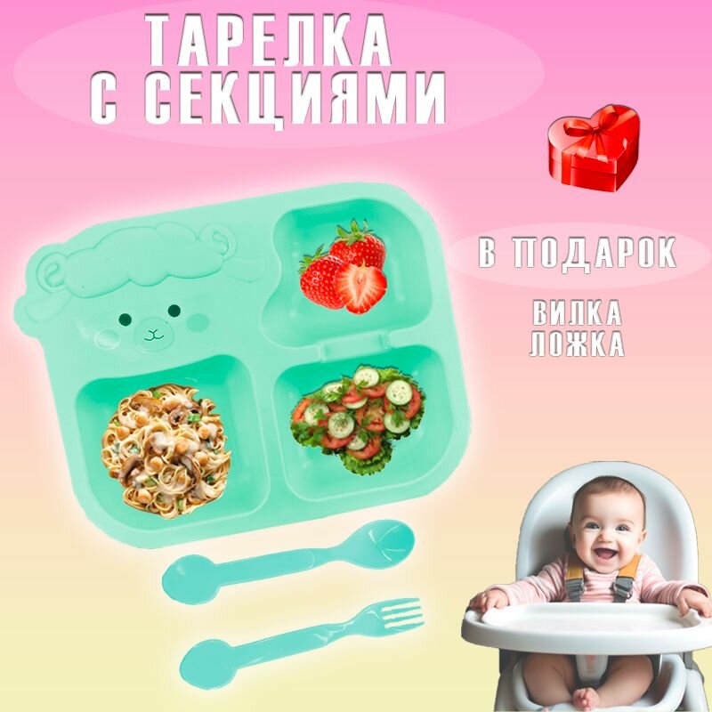 Тарелка секционная детская с приборами "Овечка" АМ-348 / Набор детской посуды, цвет зеленый интересное: