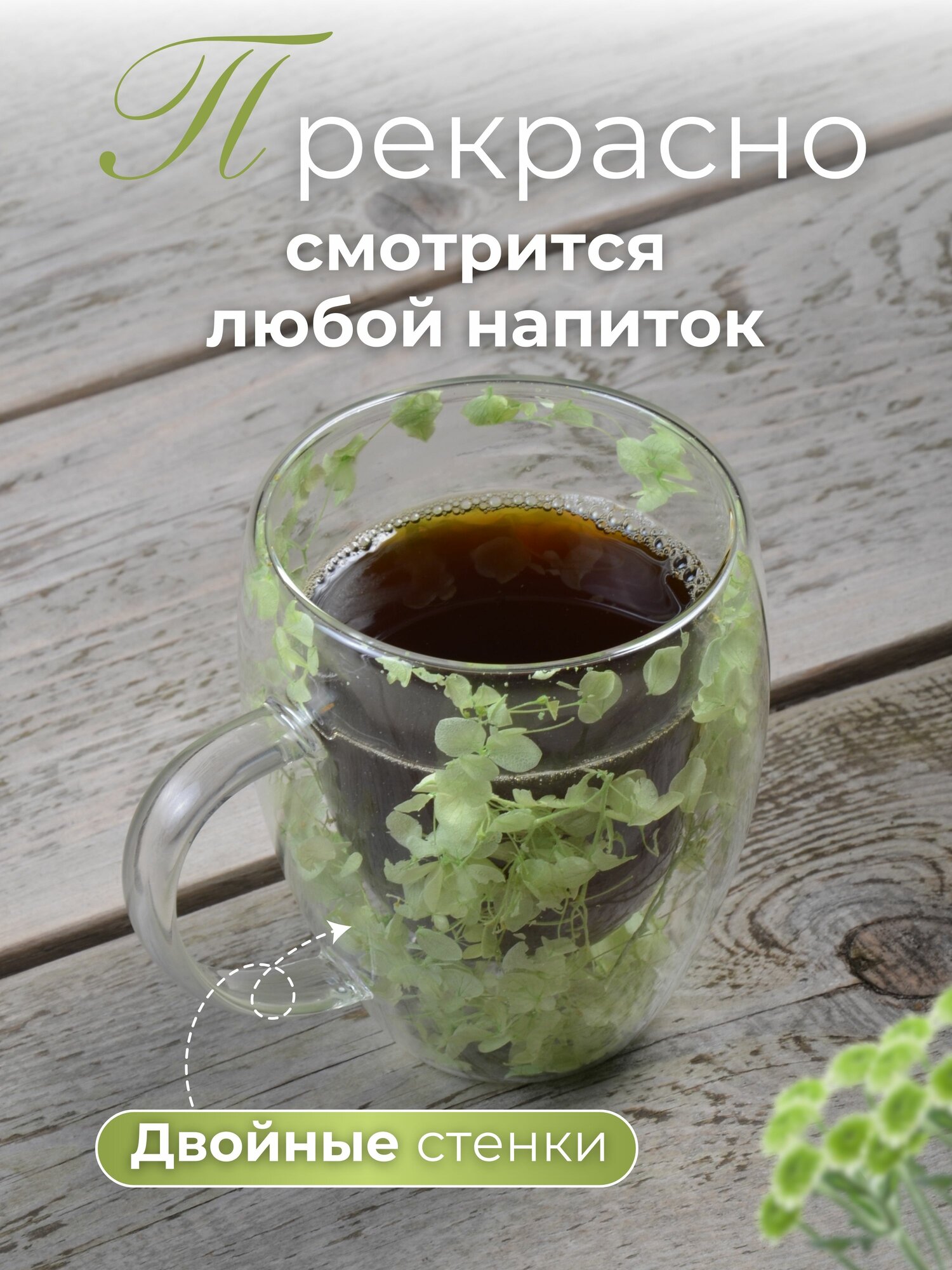 Кружка "Двойное дно", стекло, жаропрочная, с сухоцветами, зеленая, 350 мл интересное: