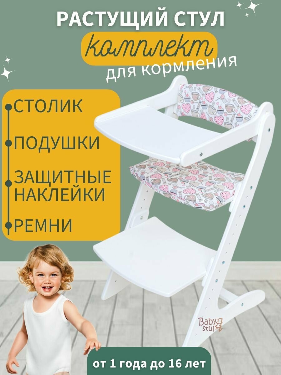 Растущий стул со столиком и подушками "Балерины белые" и ремни безопасности. Стульчик для кормления