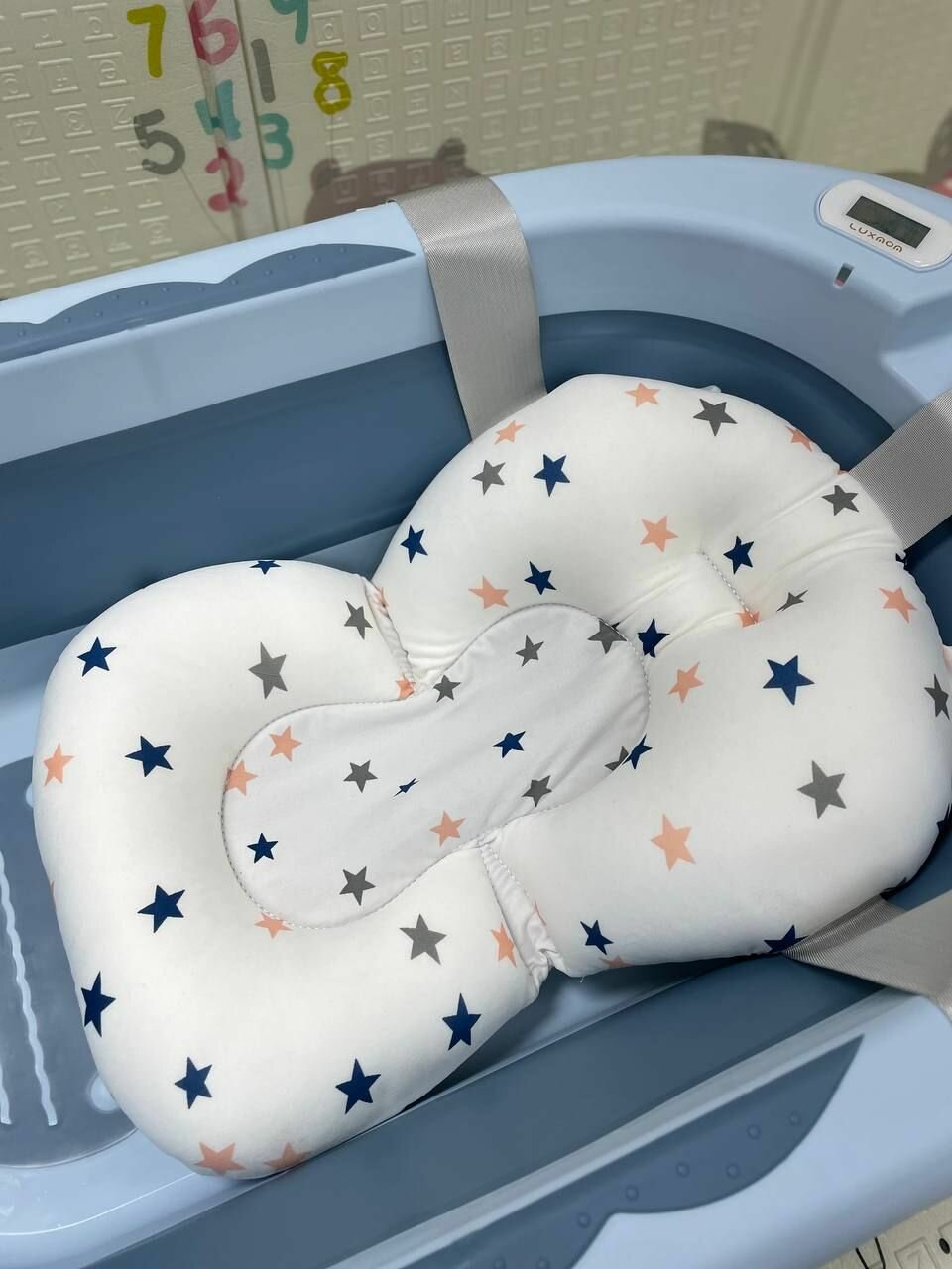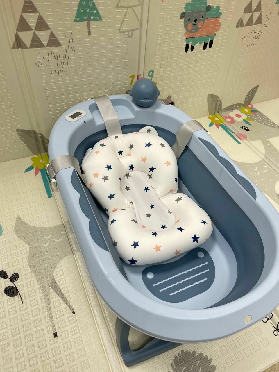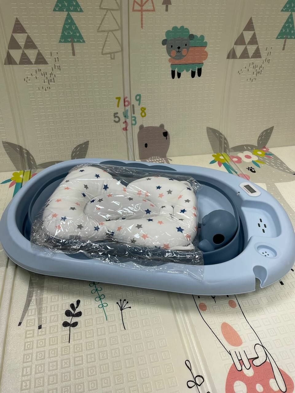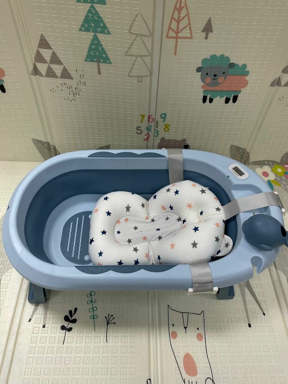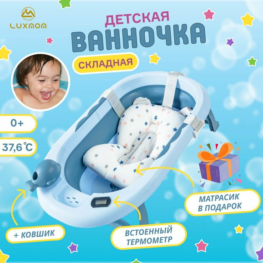 Детская ванночка для купания новорожденных с термометром и подушкой складная 81х51х22 синий интересное: