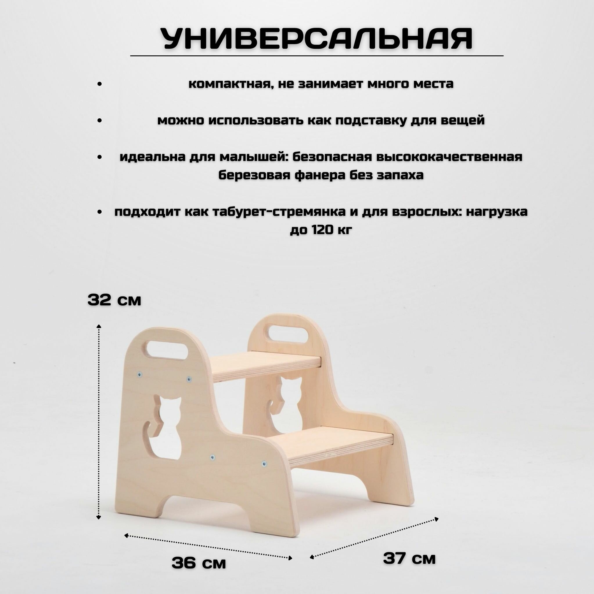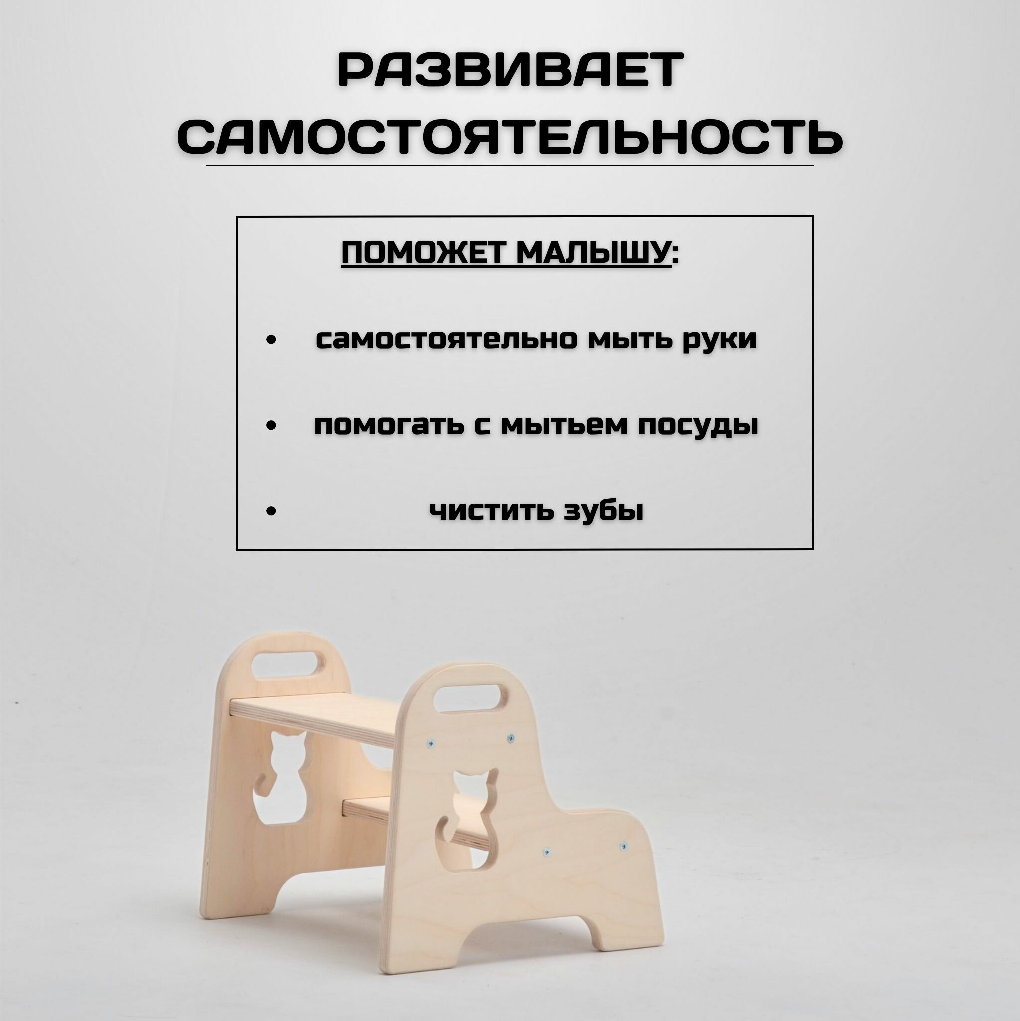 Ниже Вы можете прочитать отзывы на Детская ступенька деревянная табурет-стремянка, без шлифовки с кошечкой, ознакомится с подробными характеристиками, посмотреть интересные обзоры и фотографии на Детская ступенька деревянная табурет-стремянка, без шлифовки с кошечкой.