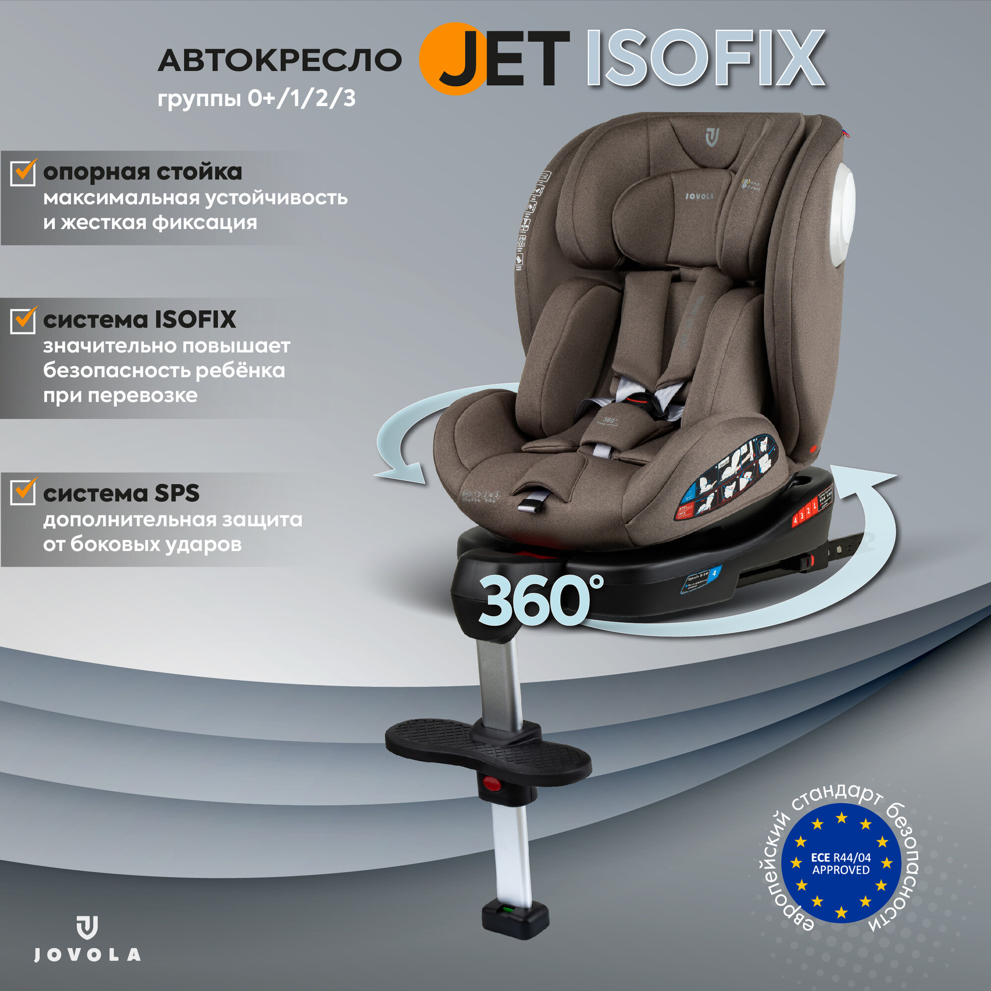 Автокресло детское Jovola Jet Isofix для новорожденных, 0-36 кг, группа 0+1+2+3, с упором в пол, серый