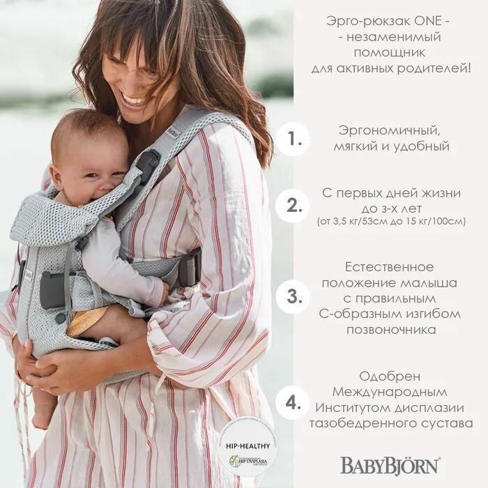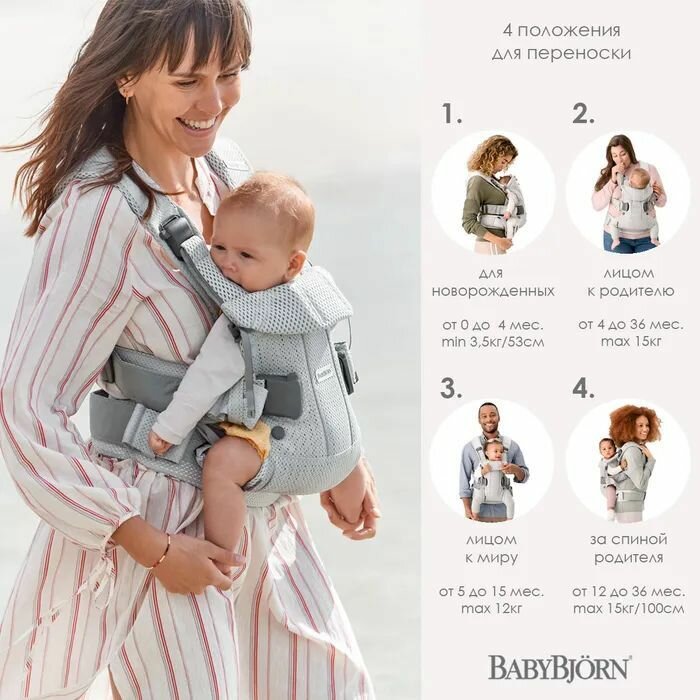 Слинг-эргорюкзак BabyBjorn One Air 3D Mesh для переноски ребенка с рождения и до 3 лет, 3 положения, светло-серый интересное: