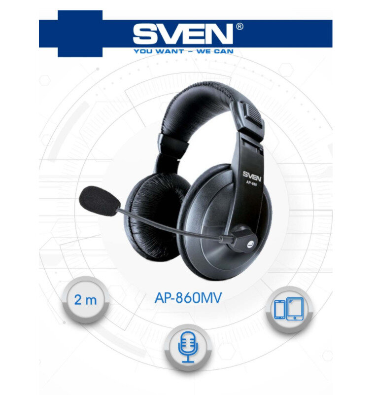 Наушники с микрофоном (гарнитура) SVEN AP-860MV, проводные, 2 м, с оголовьем, черные, SV-0410860 В комплекте: 1шт.