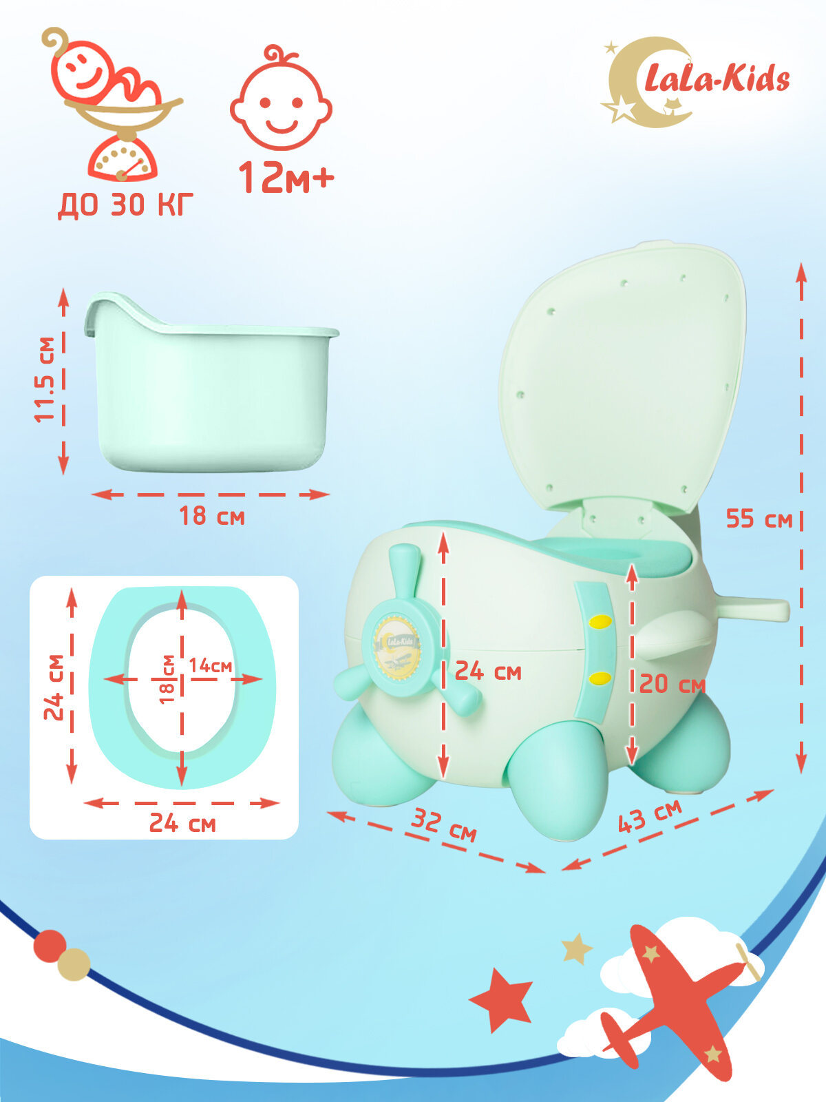 Горшок детский с мягким сиденьем и крышкой "Самолет" LaLa-Kids, зеленый интересное: