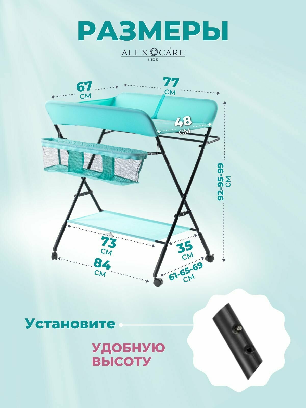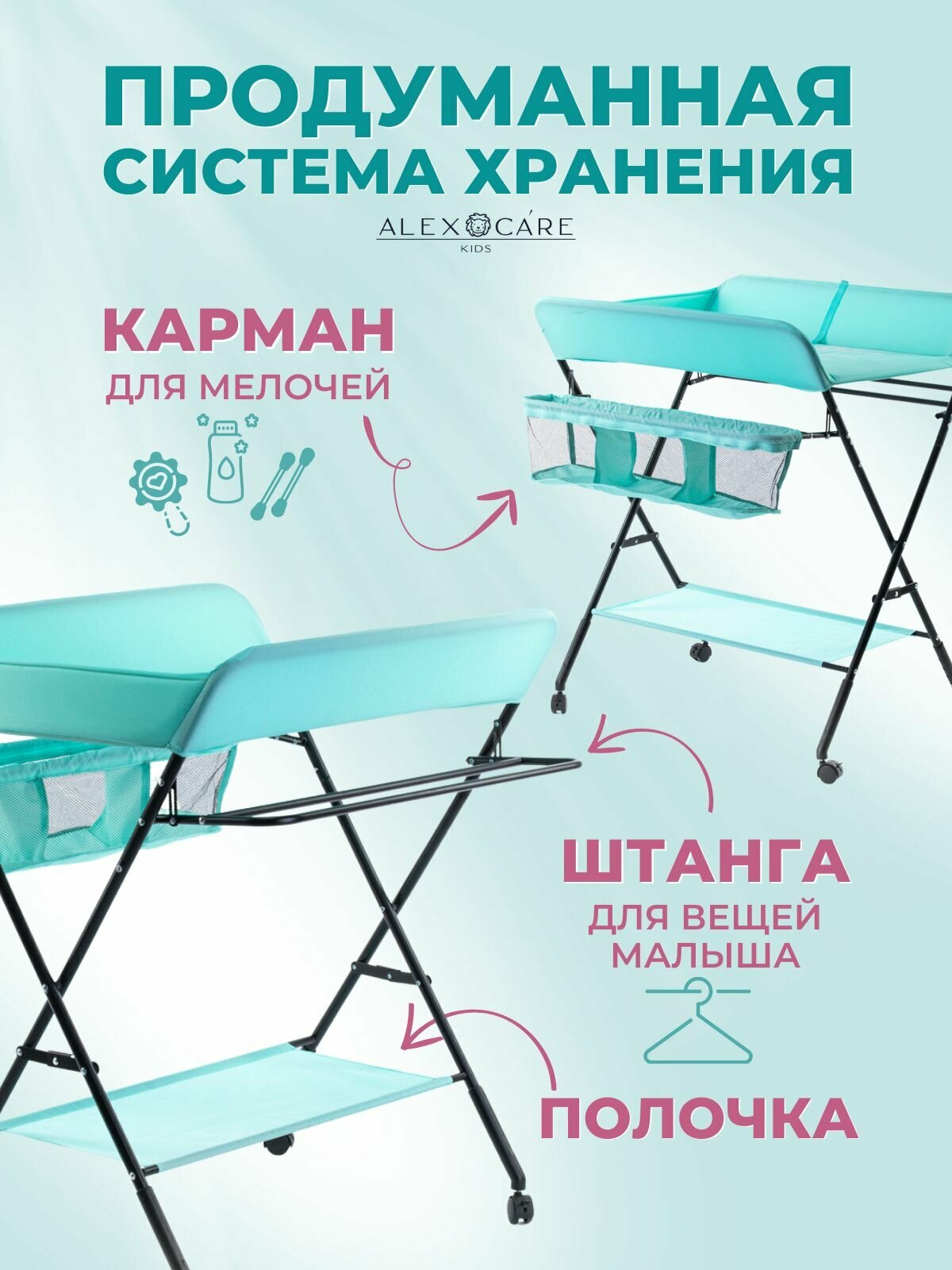 Пеленальный столик ALEX CARE KIDS, металл, ткань, Бирюзовый, Размер - 48х77х80 см интересное: