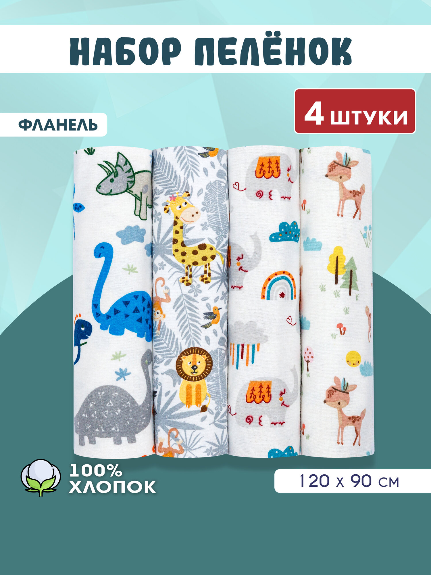 Фланелевые пеленки для новорожденных 4 шт 90х120 см, набор цветов №9 интересное: