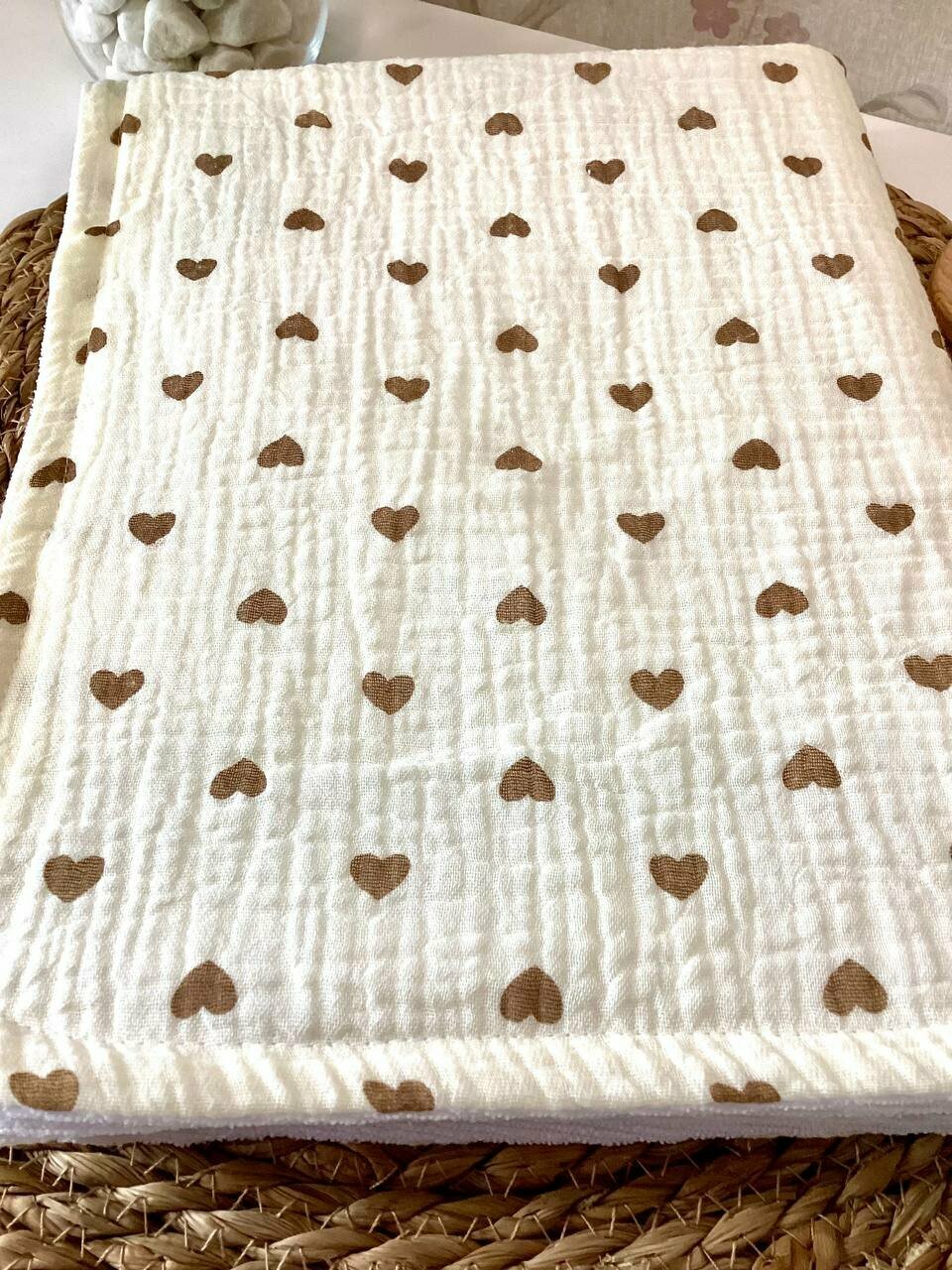 Купить Муслиновая непромокаемая многоразовая пелёнка 60/90 см "Сердечки на бежевом"