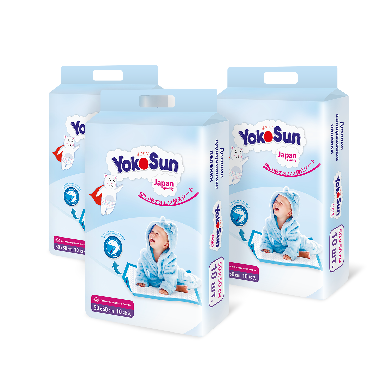 Купить Детские одноразовые пеленки YokoSun 50 х 50 см с липкой лентой для фиксации, набор 3 уп. х 10 шт. (30 шт.)