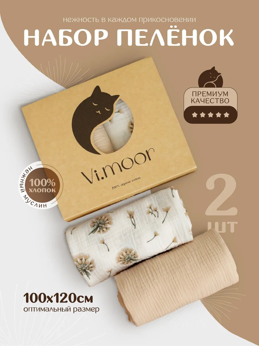 Купить Муслиновые пелёнки vi.moor, многоразовые, хлопок, 100x120см, 2 шт