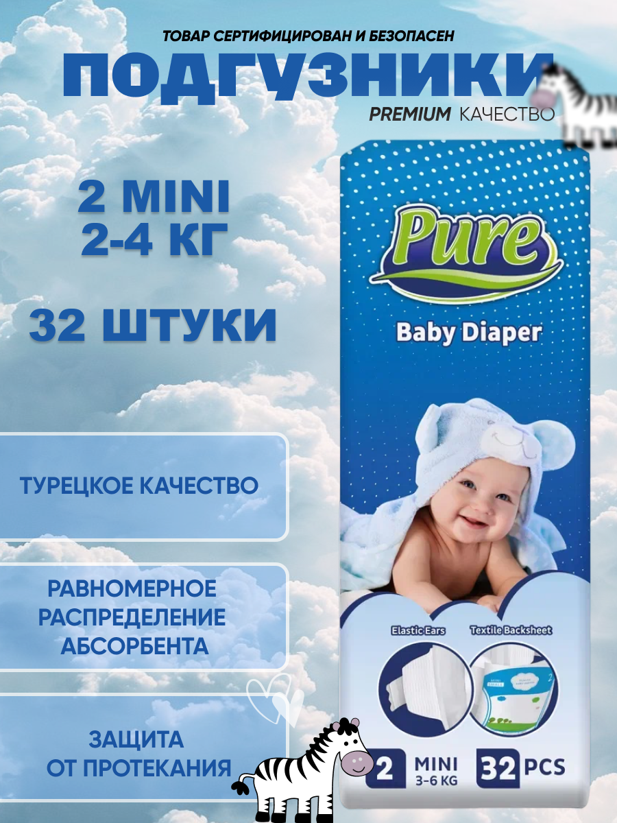 Pure Baby Diapers - подгузники для малышей весом от 3 до 6 кг, 32 штуки в упаковке интересное: