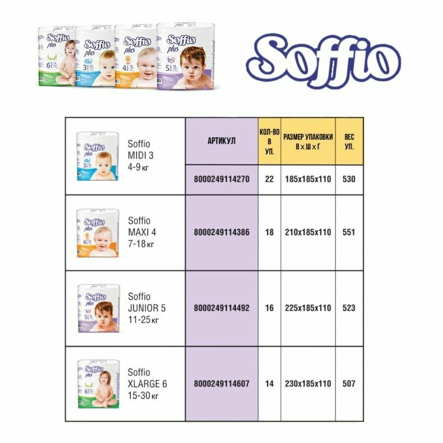 Ниже Вы можете прочитать отзывы на Soffio Plus подгузники детские 7-18 кг размер Maxi 4, 18 шт., ознакомится с подробными характеристиками, посмотреть интересные обзоры и фотографии на Soffio Plus подгузники детские 7-18 кг размер Maxi 4, 18 шт..