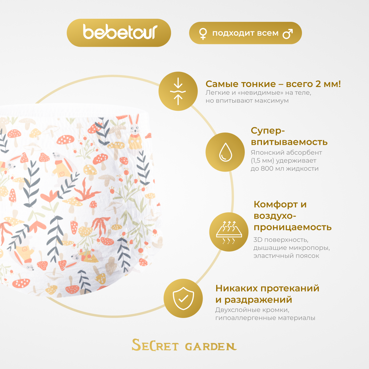 Подгузники Bebetour "Alice's Secret Garden", размер 2, 4-8кг, 3шт