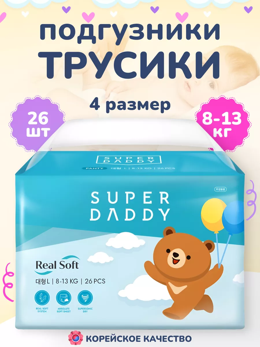 Купить Подгузники памперсы Super Daddy, 4 размер, для детей весом 8-13 кг, 26 штук
