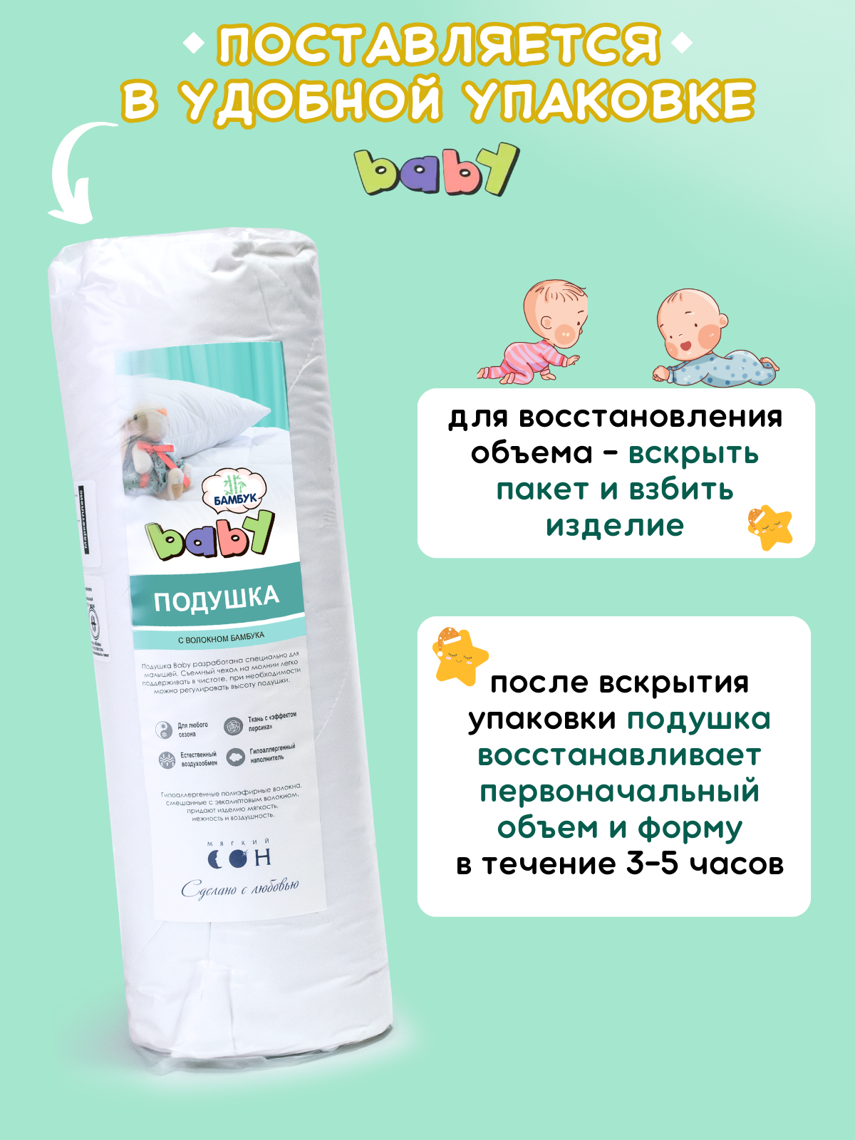 Подушка детская 40х60 см, Бамбук, со съемным чехлом, для младенцев, для новорожденных
