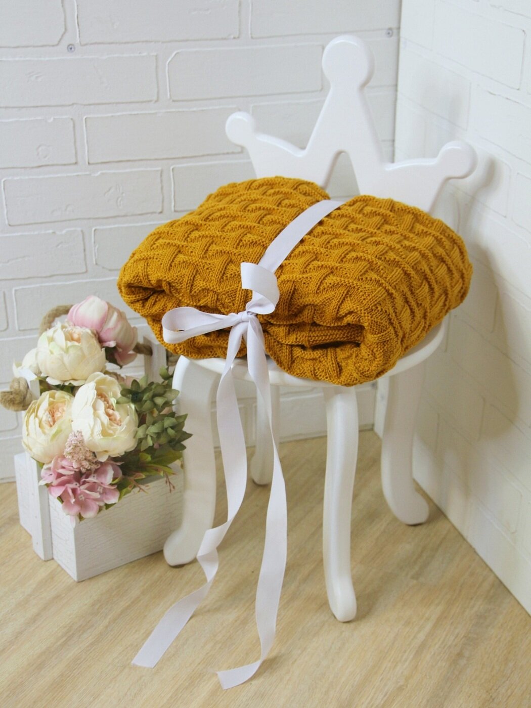 Купить Плед вязаный хлопковый на односпальную кровать Wave 160х95 см / горчичный