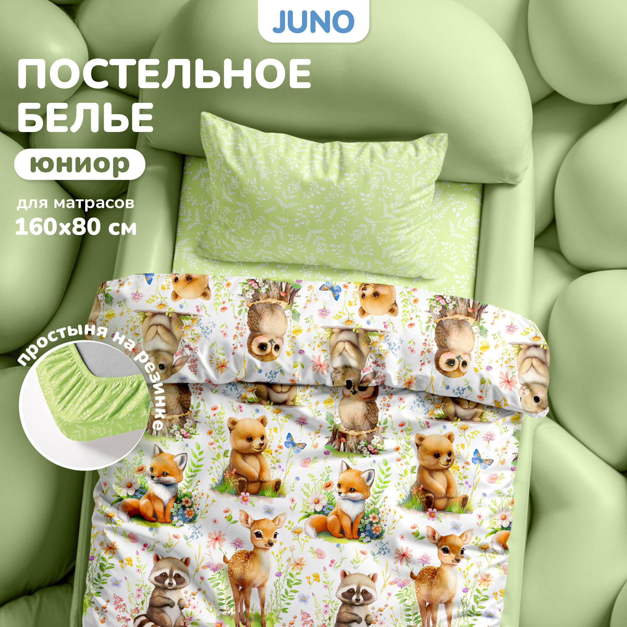 Купить Детское постельное белье в кроватку Juno, Поплин, на резинке 160х80 см, нав. 40х60, Лесные зверята