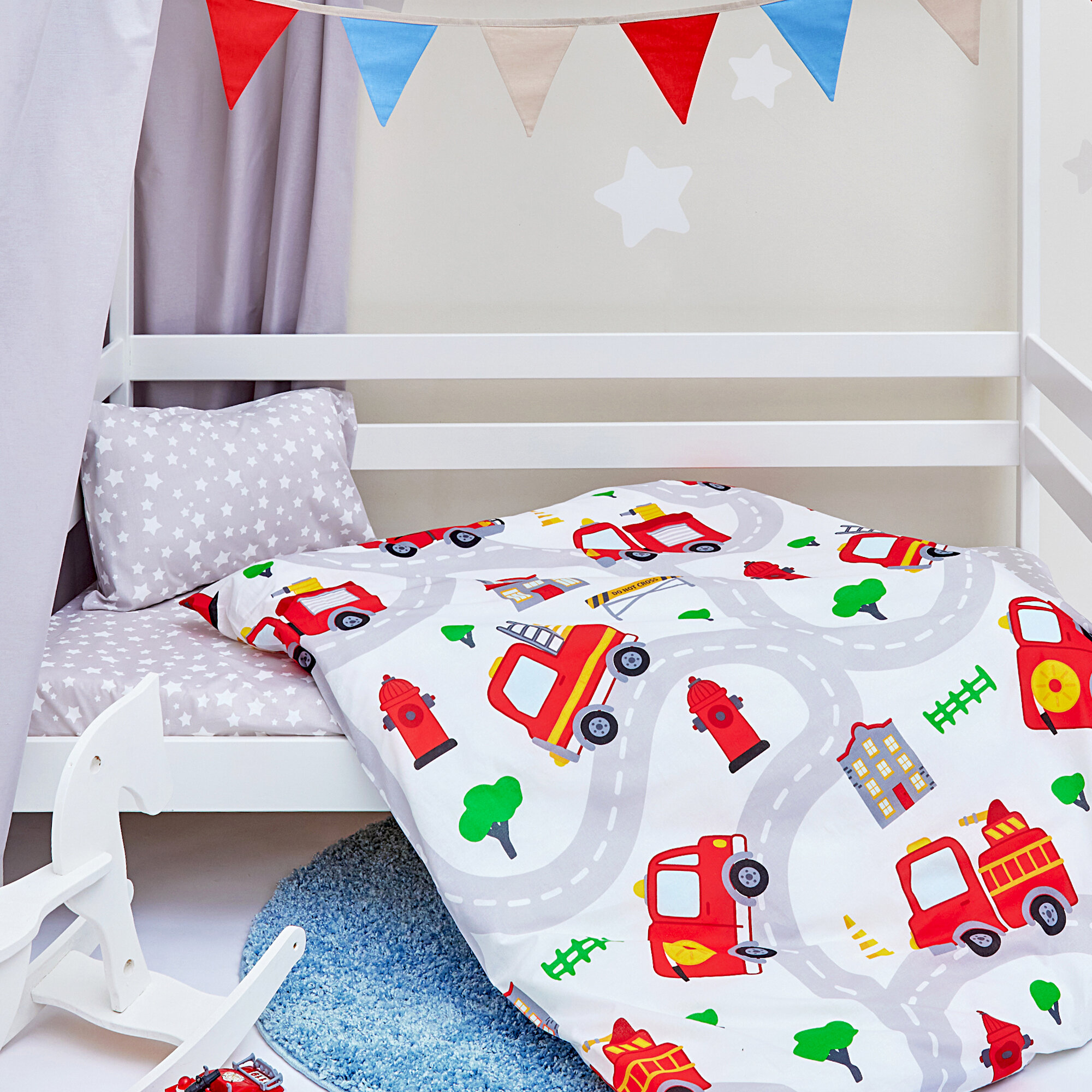 Купить Детское постельное белье в кроватку Juno, Поплин, на резинке 160х80 см, нав. 40х60, Пожарные машинки
