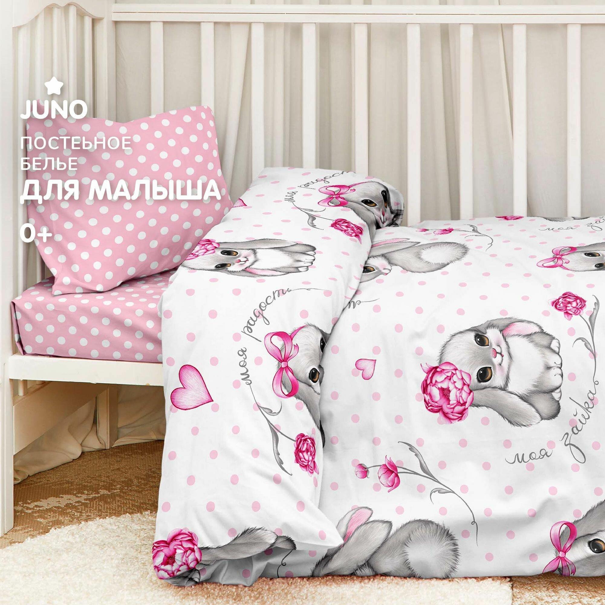 СохранитьДетское постельное белье в кроватку для новорожденного Juno, Поплин, нав. 40х60, Милые зайки интересное: