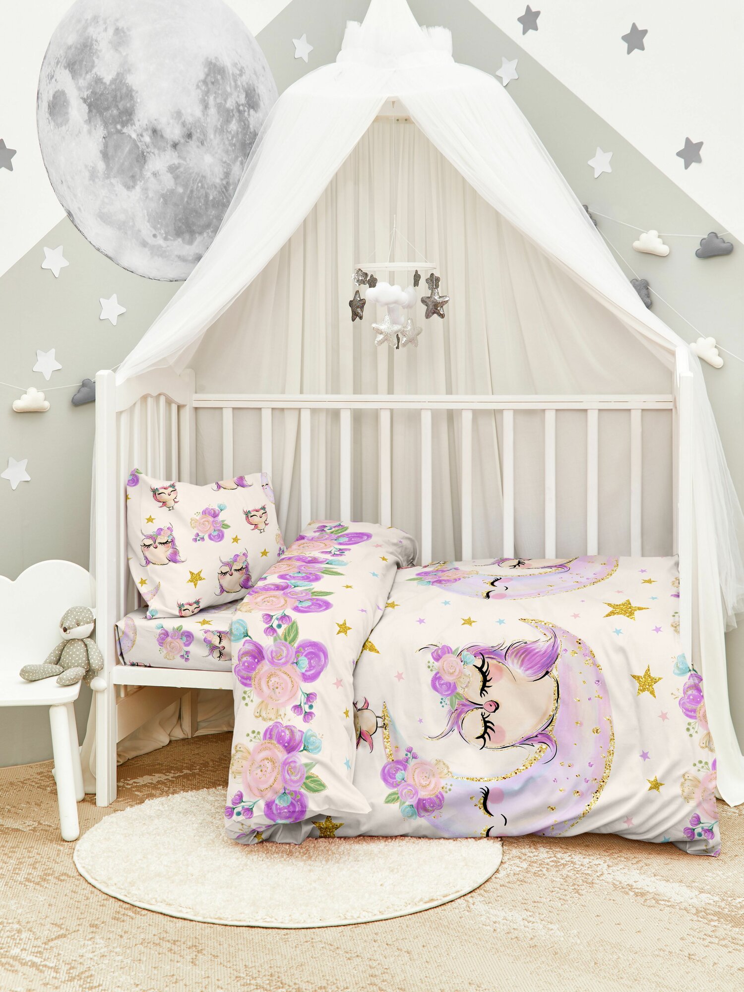 Детское постельное белье в кроватку для новорожденного Juno, Поплин, нав. 40х60, Лунный мишка