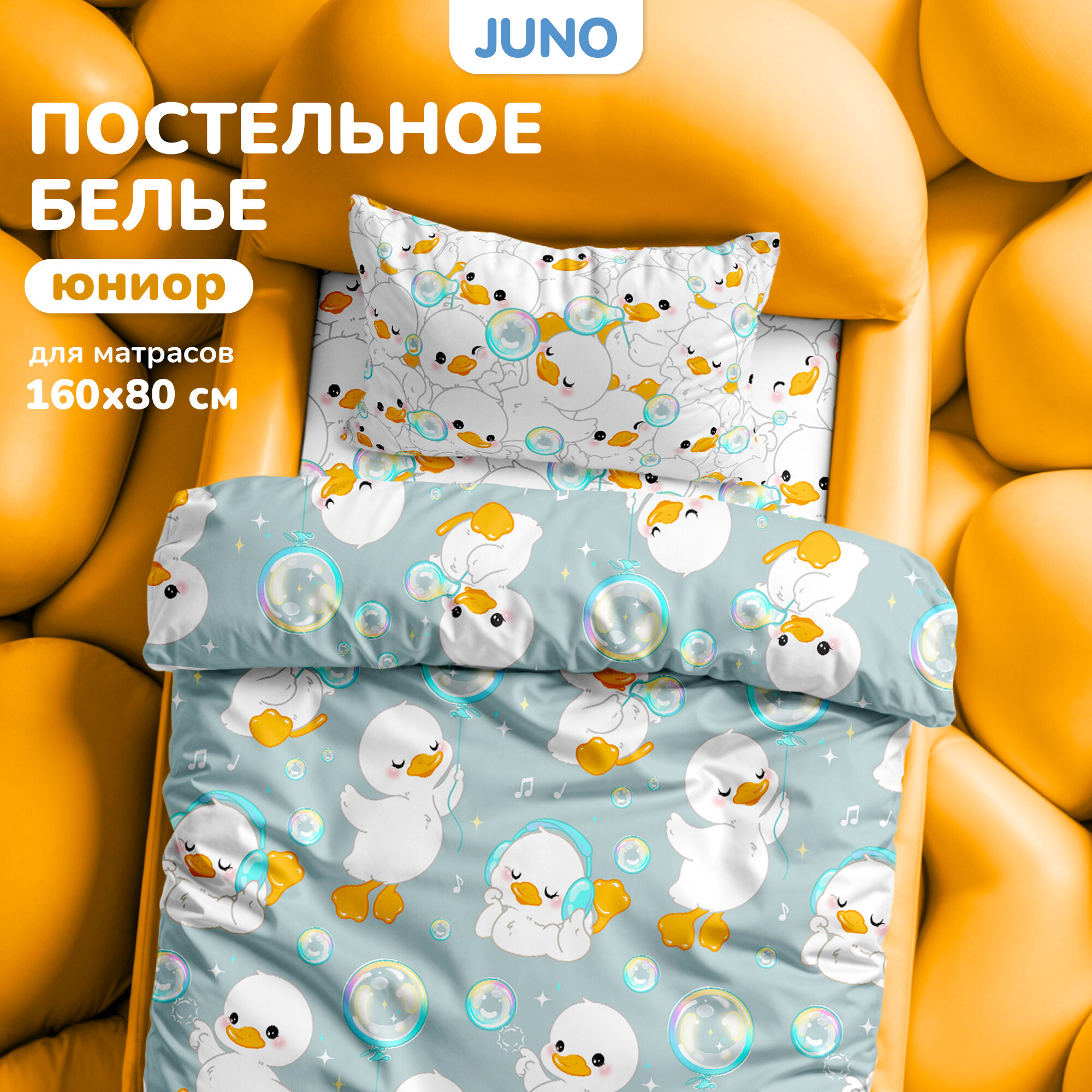 Детское постельное белье в кроватку Juno, Поплин, для матрасов 160х80 см, нав. 40х60, Гусь га га га