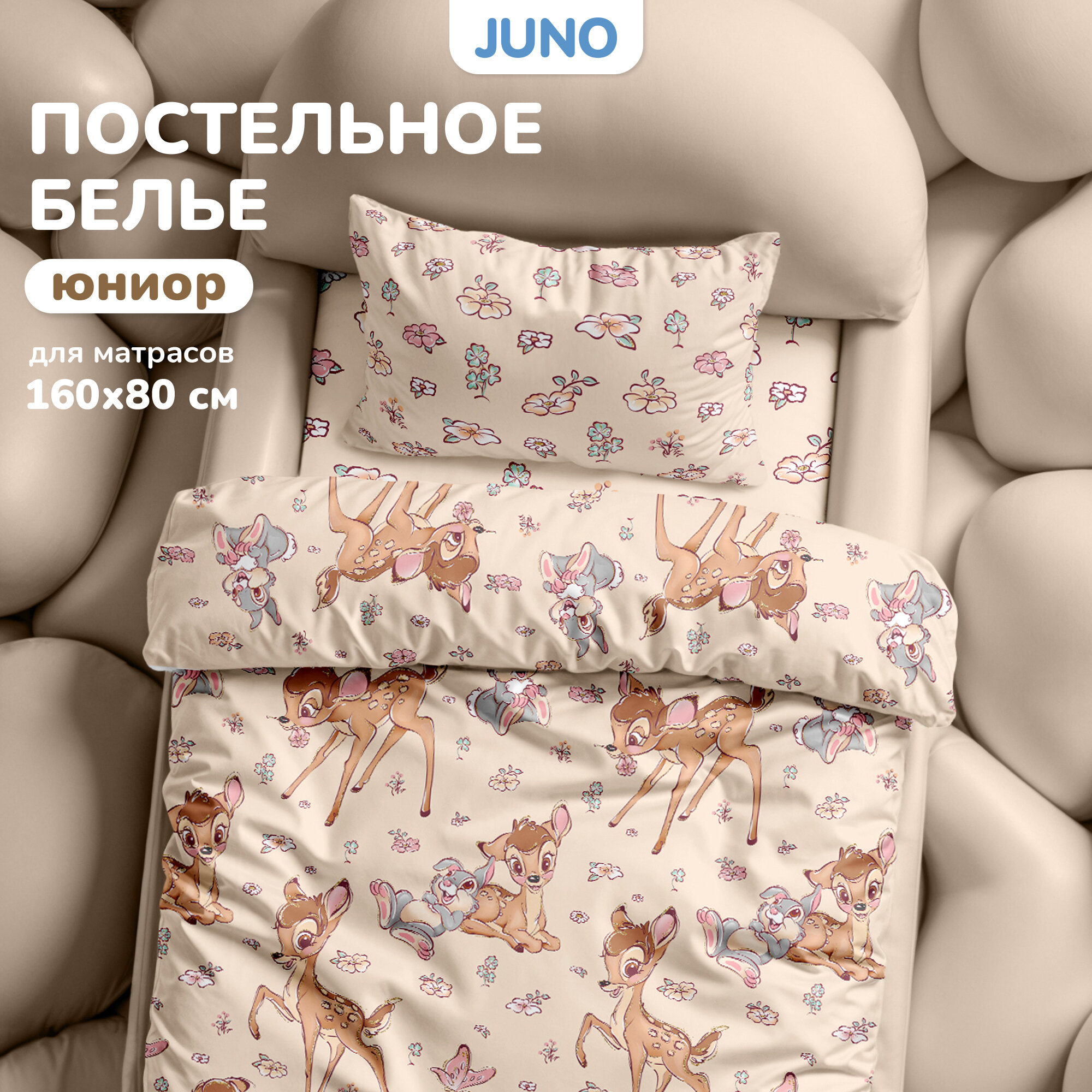 СохранитьДетское постельное белье в кроватку Juno, Поплин, для матрасов 160х80 см, нав. 40х60, Бэмби интересное: