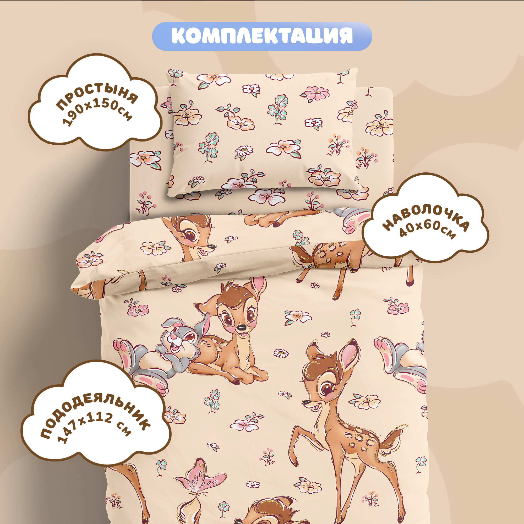 Купить Детское постельное белье в кроватку Juno, Поплин, для матрасов 160х80 см, нав. 40х60, Бэмби