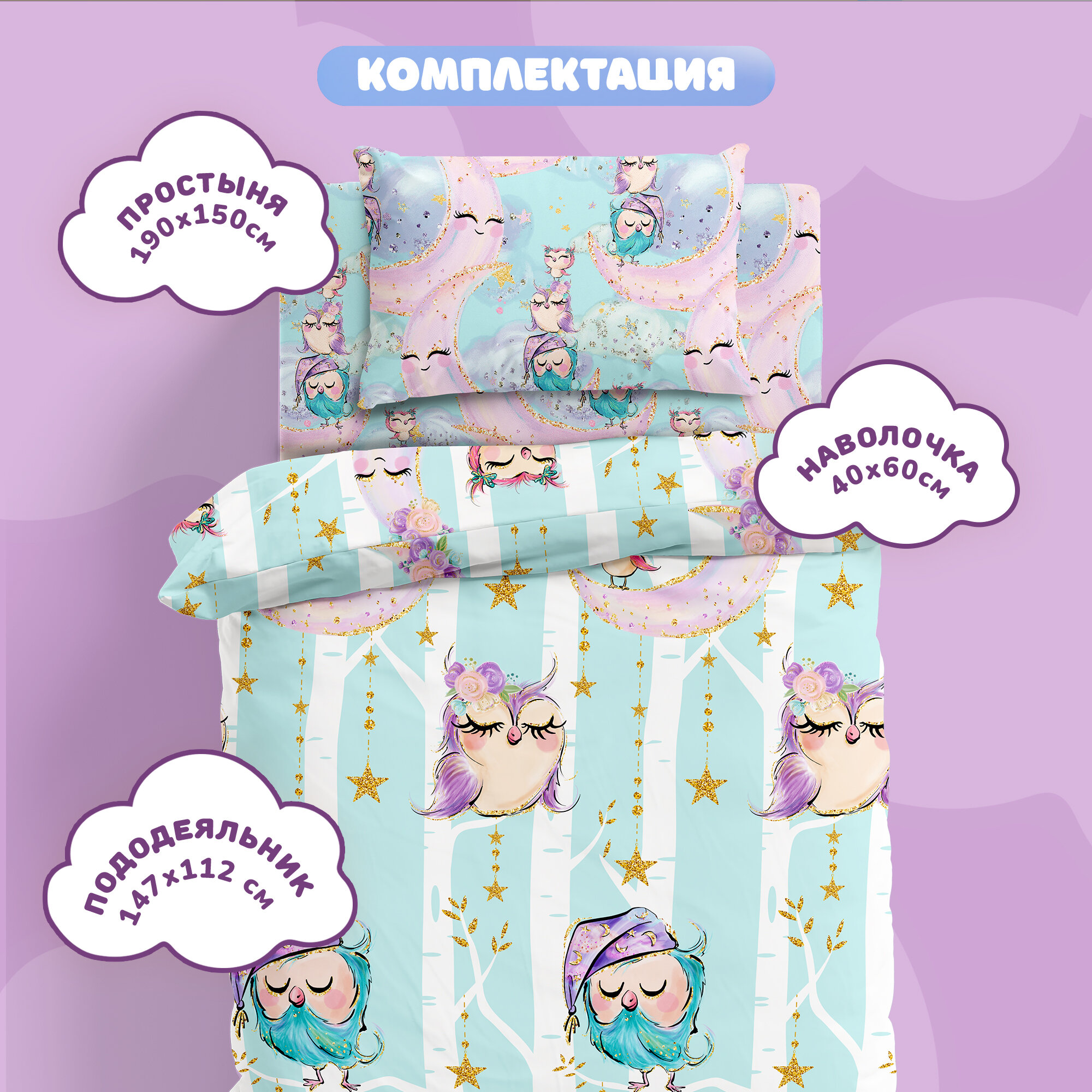 Купить Детское постельное белье в кроватку Juno, Поплин, для матрасов 160х80 см, нав. 40х60, Sleep owls