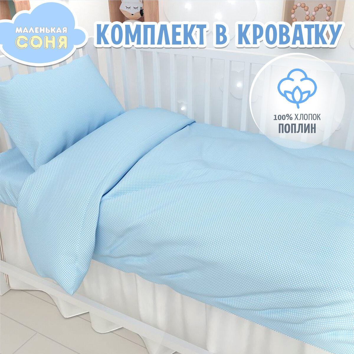 Постельное белье в детскую кроватку Маленькая Соня Мелкий горох голубой, хлопок, поплин интересное:
