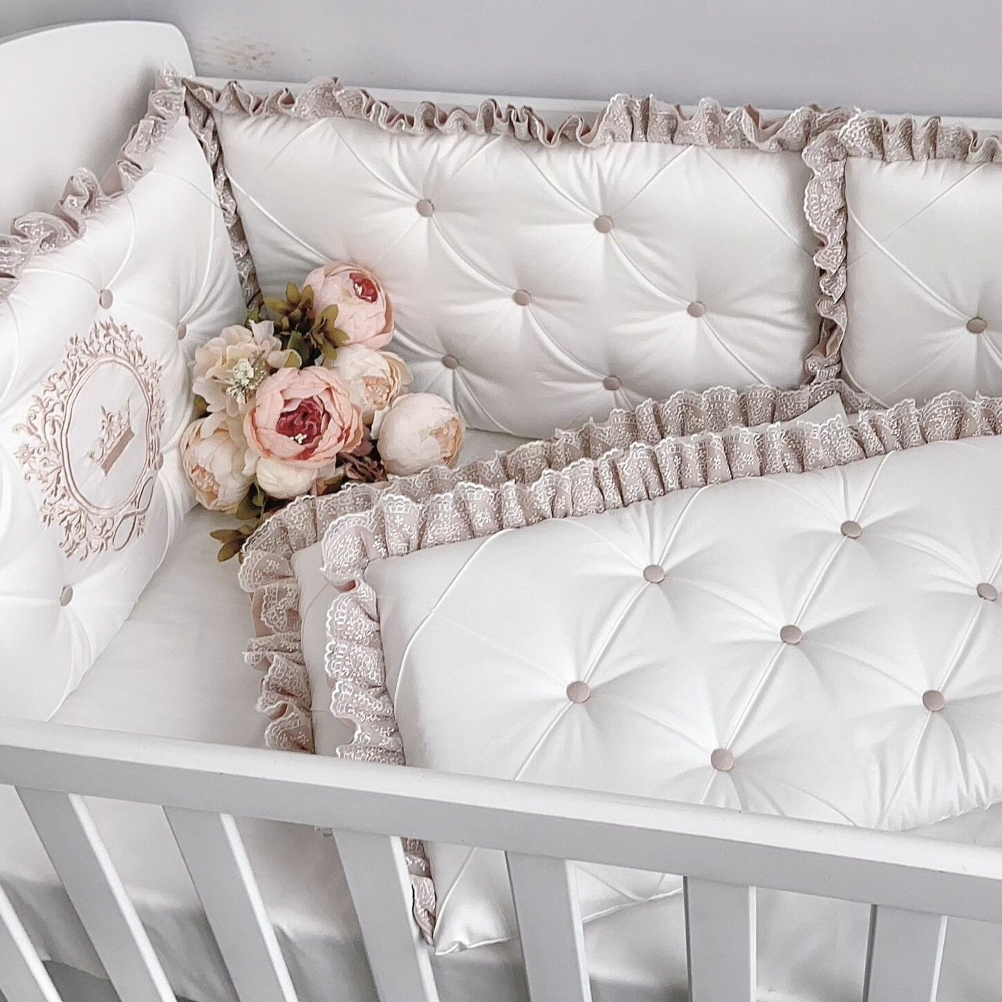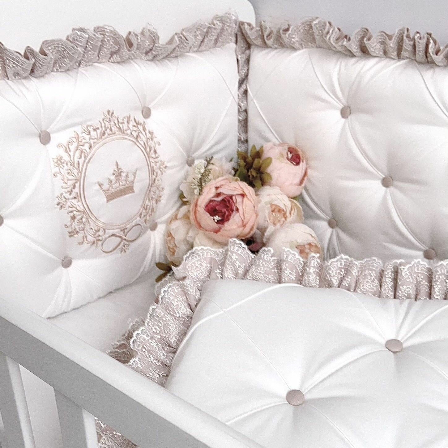 Бортики в кроватку для новорожденных + простыня "Утонченность", с бежевыми рюшами, в кроватку для новорожденных 120*60 см или овальной 125*75 см, сатин и тенсель, KrisFi