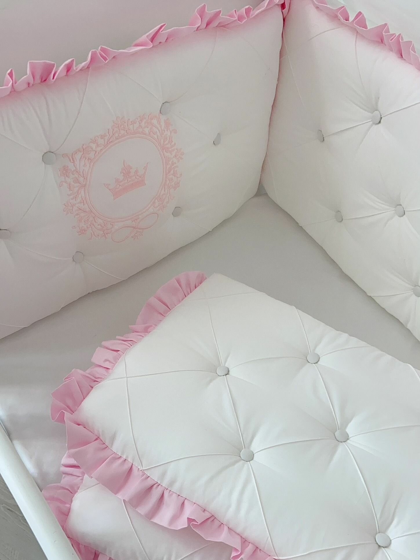Бортики в кроватку для новорожденных + простыня, "Утонченность", пудровый, сатин, в кроватку для новорожденных 120*60 см или овальной 125*75 см, KrisFi
