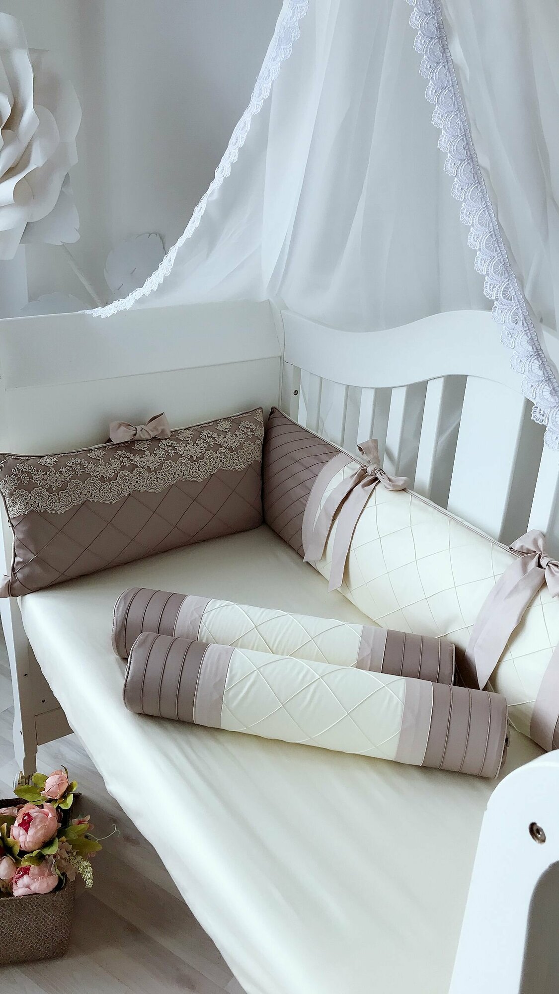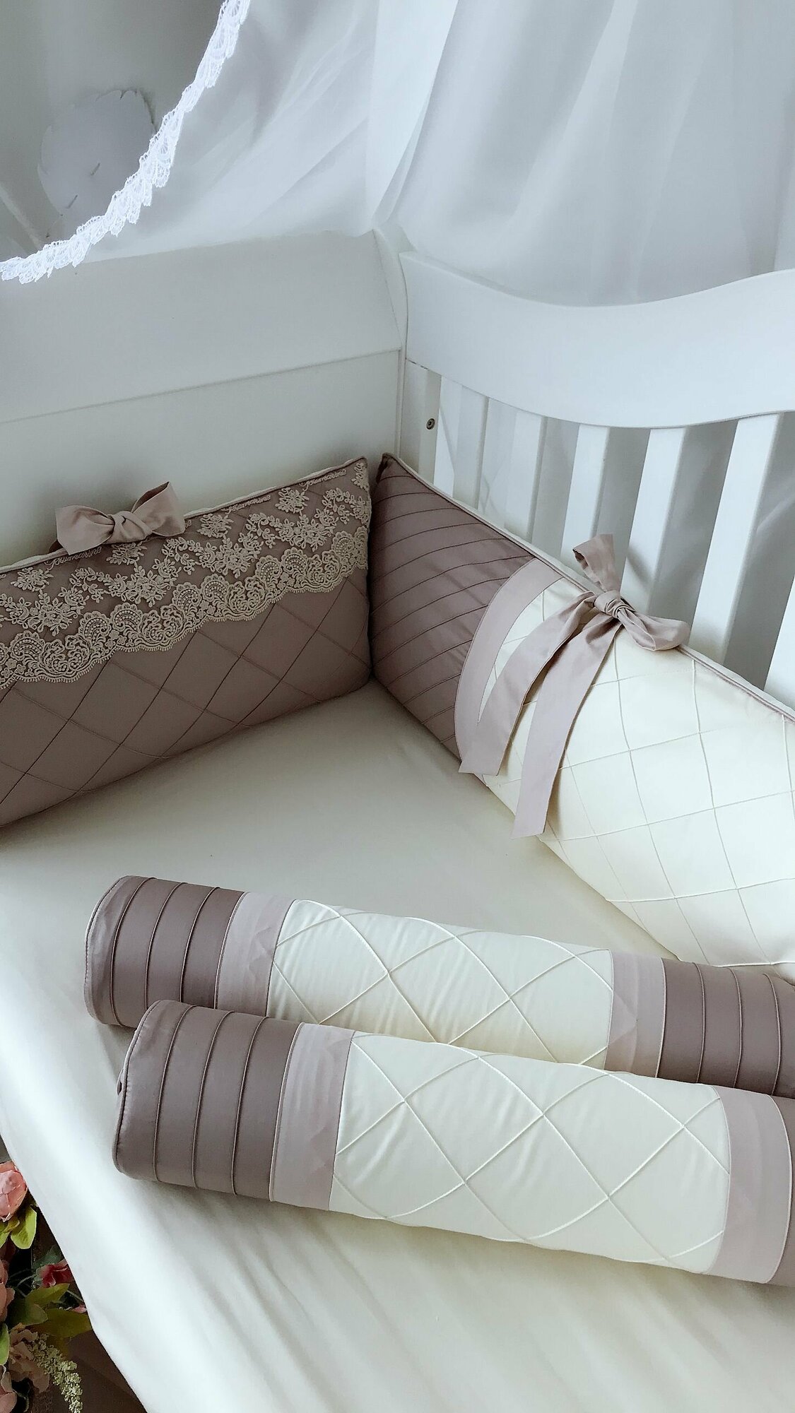 Бортики в кроватку для новорожденных + простыня "Утонченность", с бежевыми рюшами, в кроватку для новорожденных 120*60 см или овальной 125*75 см, сатин и тенсель, KrisFi