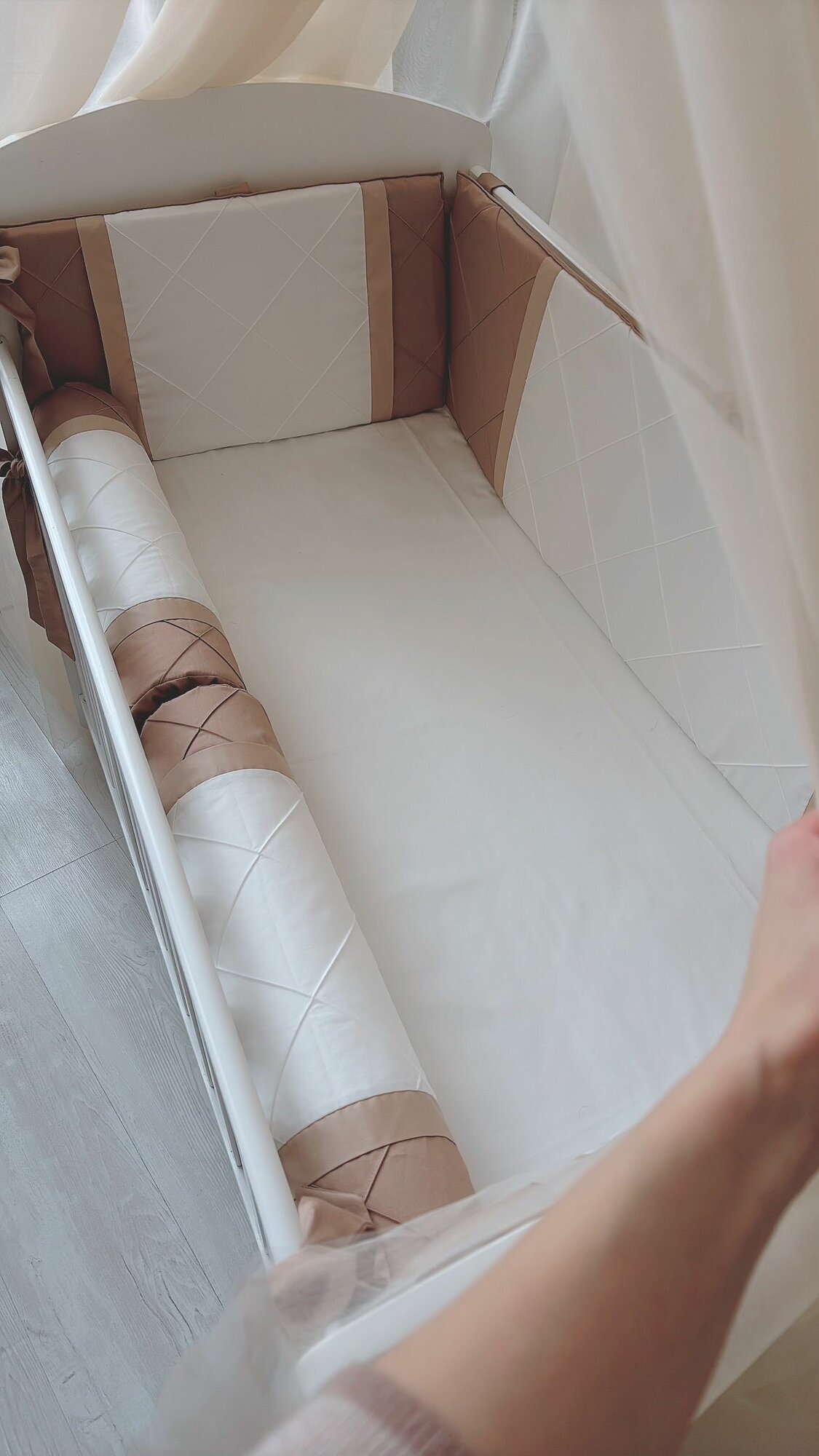 Бортики в кроватку для новорожденных + простыня "Утонченность", с бежевыми рюшами, в кроватку для новорожденных 120*60 см или овальной 125*75 см, сатин и тенсель, KrisFi