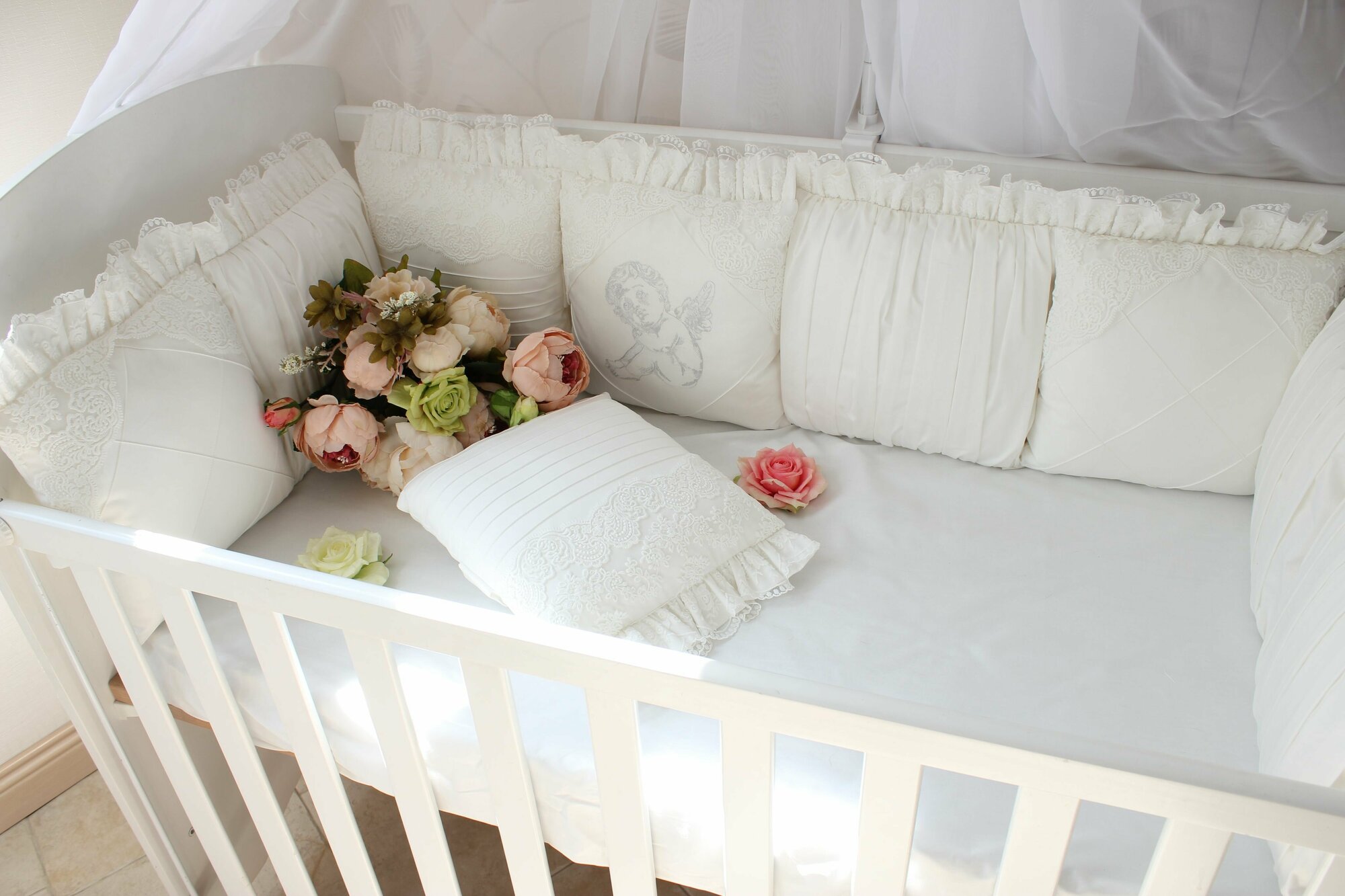 Купить Бортики в кроватку для новорожденных "Роскошь" с большим количеством кружева, в кроватку 120*60 см или в овальную 125*75 см, сатин