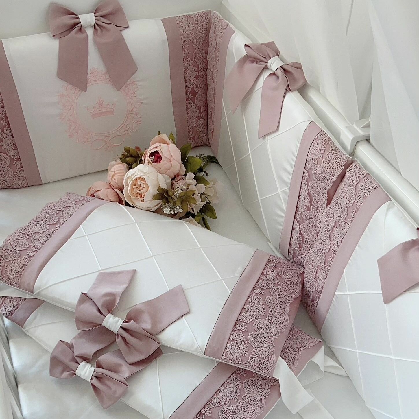 Купить Бортики в кроватку для новорожденного "Вдохновение", пудровый, 4 подушки на 3 стороны кроватки 120*60 см, 125*65 см, сатин, KrisFi