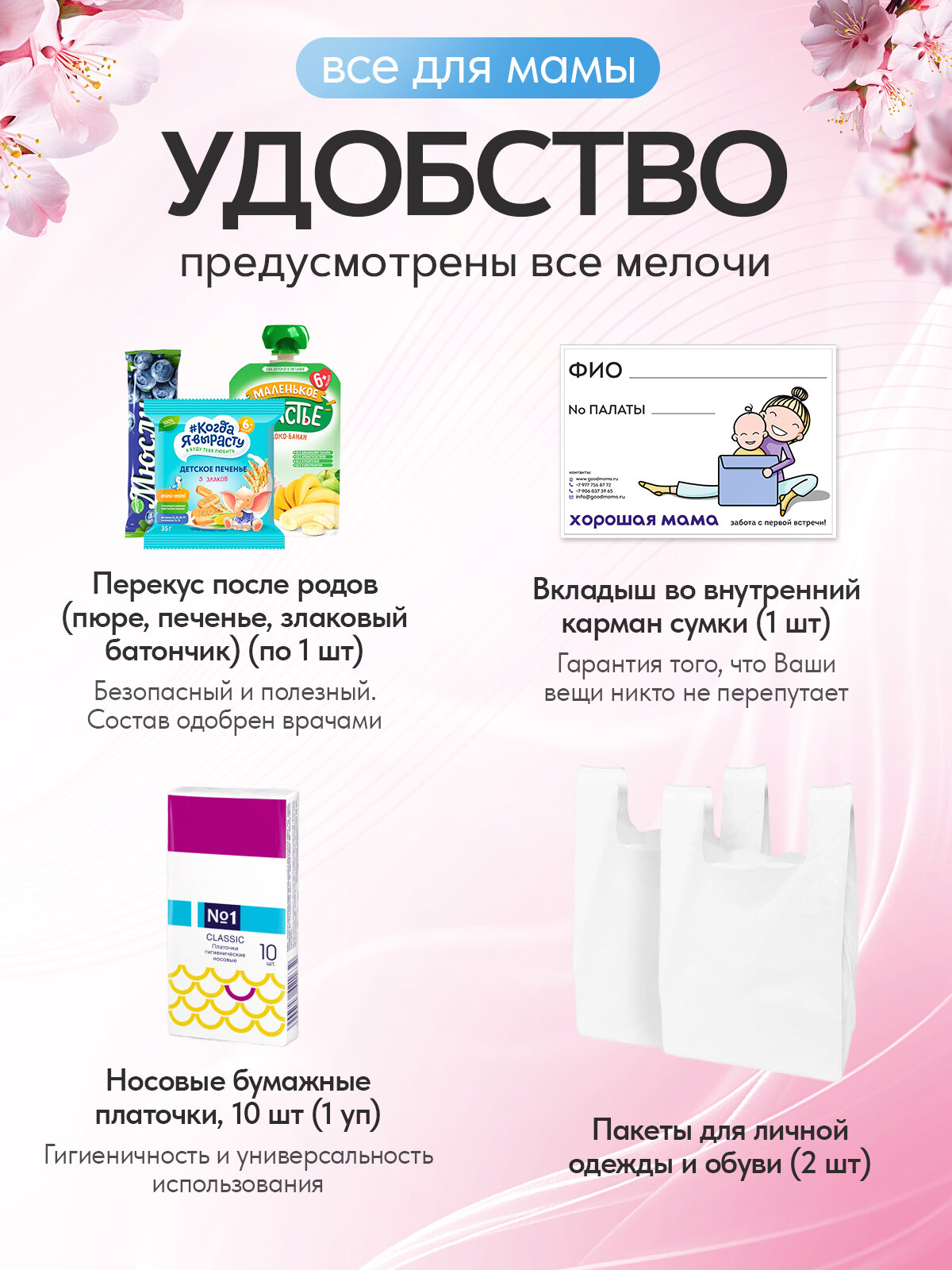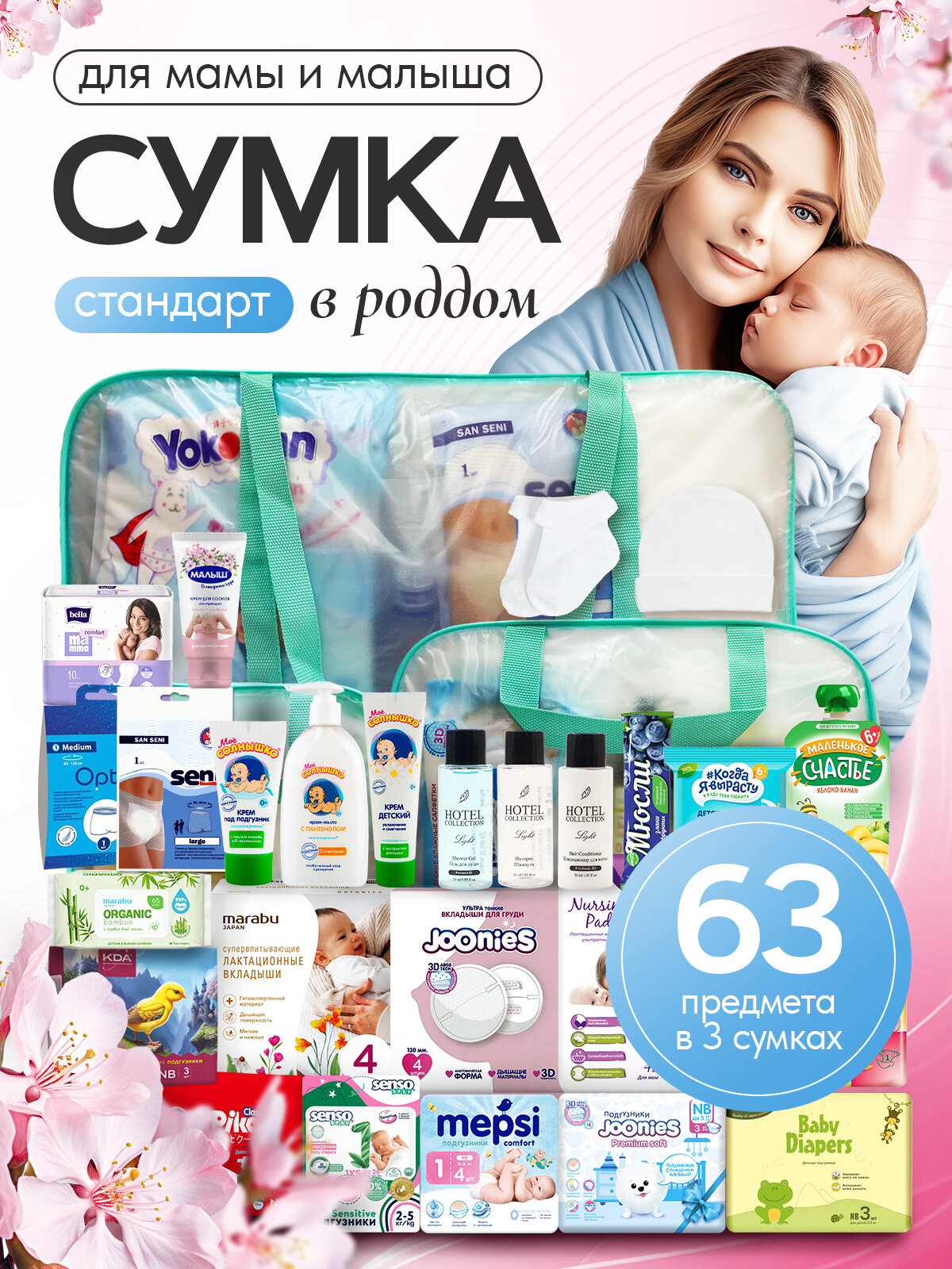 Готовая сумка в роддом для малыша и мамы с одеждой "Стандарт", 63 предмета, тиффани матовый интересное: