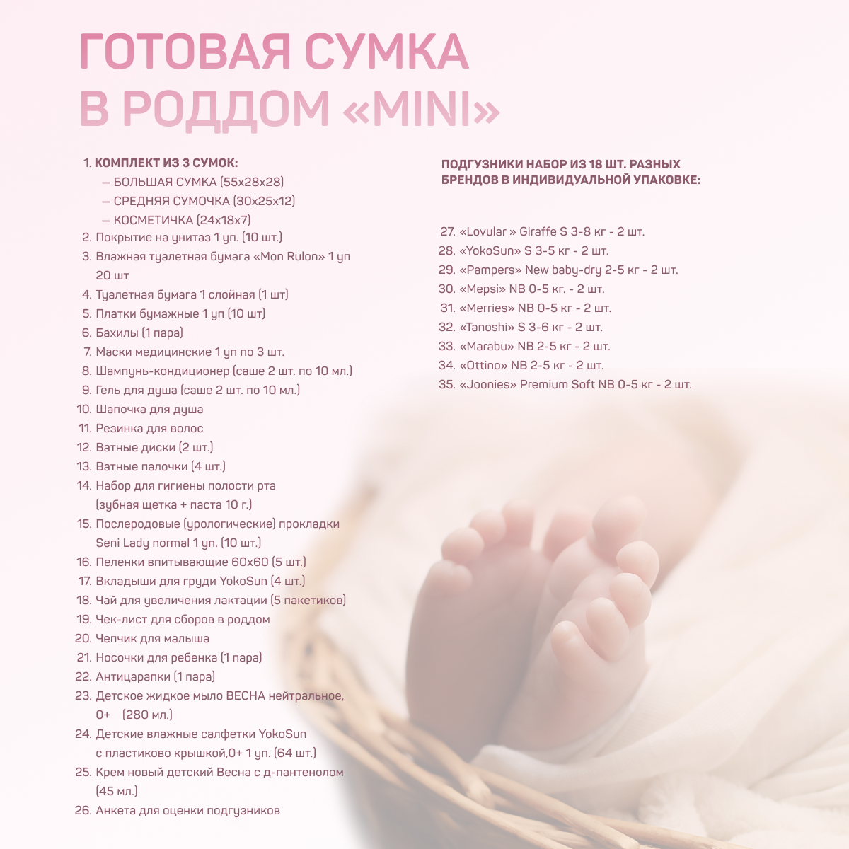 Сумка в роддом готовая для мамы и малыша с наполнением, 35 предметов, матовая интересное: