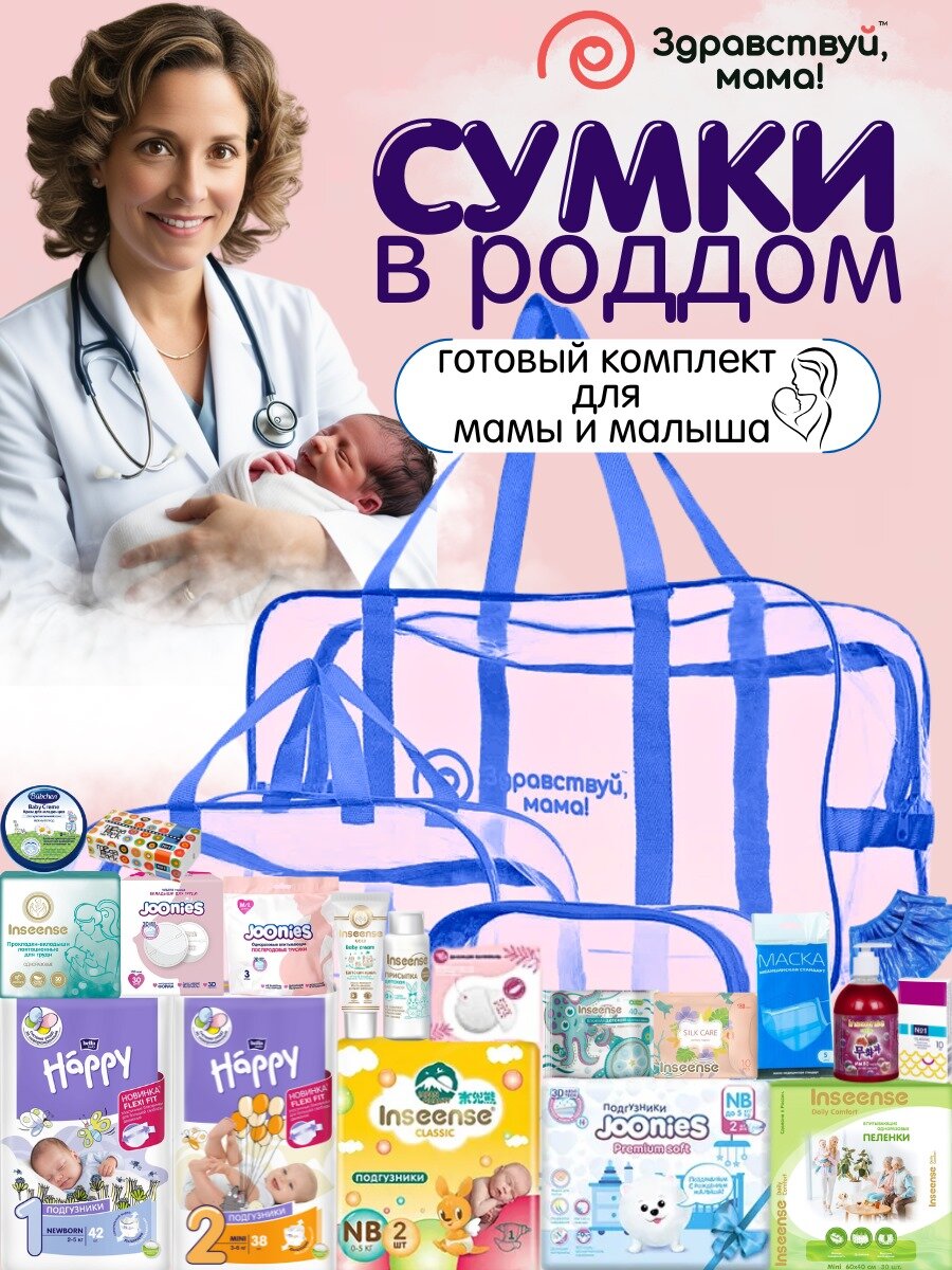 Готовая сумка в роддом, для мамы и малыша с наполнением "ЗДРАВСТВУЙ, МАМА!", васильковый, набор из 3 сумок, 24 предмета интересное: