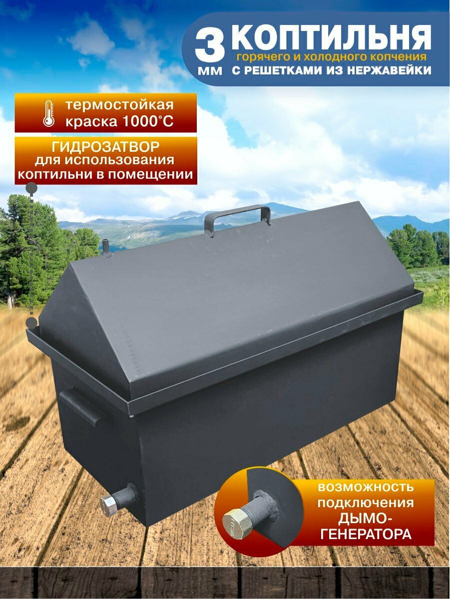 Коптильня горячего и холодного копчения из черной стали 2мм с гидрозатвором и с решетками из нержавеющей стали