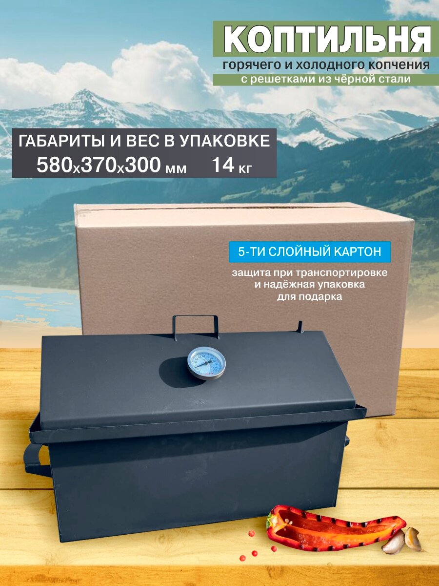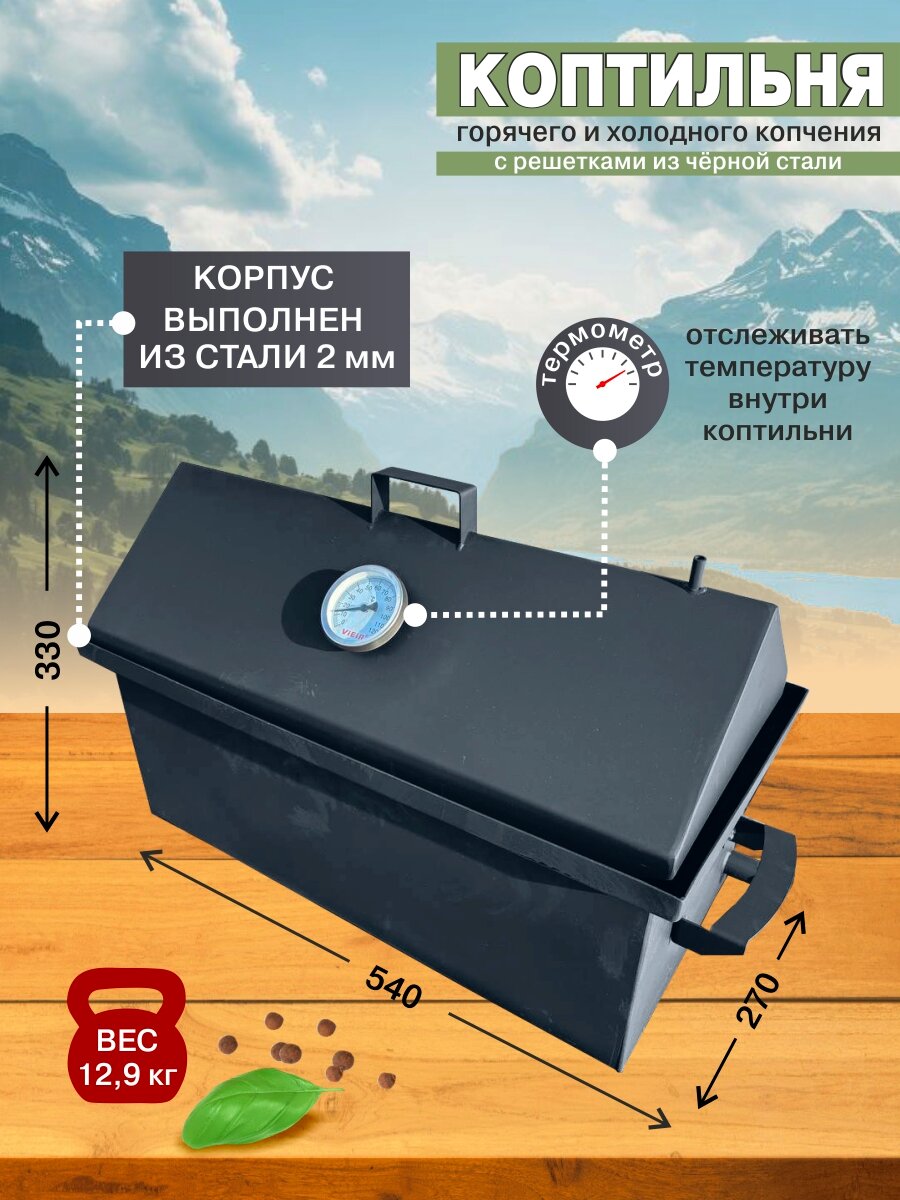 Коптильня горячего и холодного копчения из черной стали 2мм с гидрозатвором и с решетками из нержавеющей стали