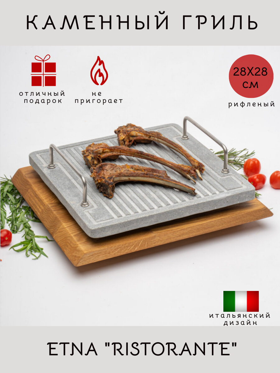 Каменный гриль + Дубовая доска. "RISTORANTE" Для жарки мяса, рыбы и овощей на столе, мангале или в духовке. Вулканический камень 280х280 мм интересное: