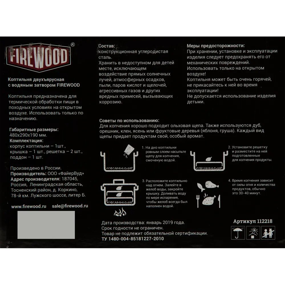 Коптильня FireWood, с водяным затвором, стальная, чёрная, 48х29х19 см, 6,5 кг интересное: