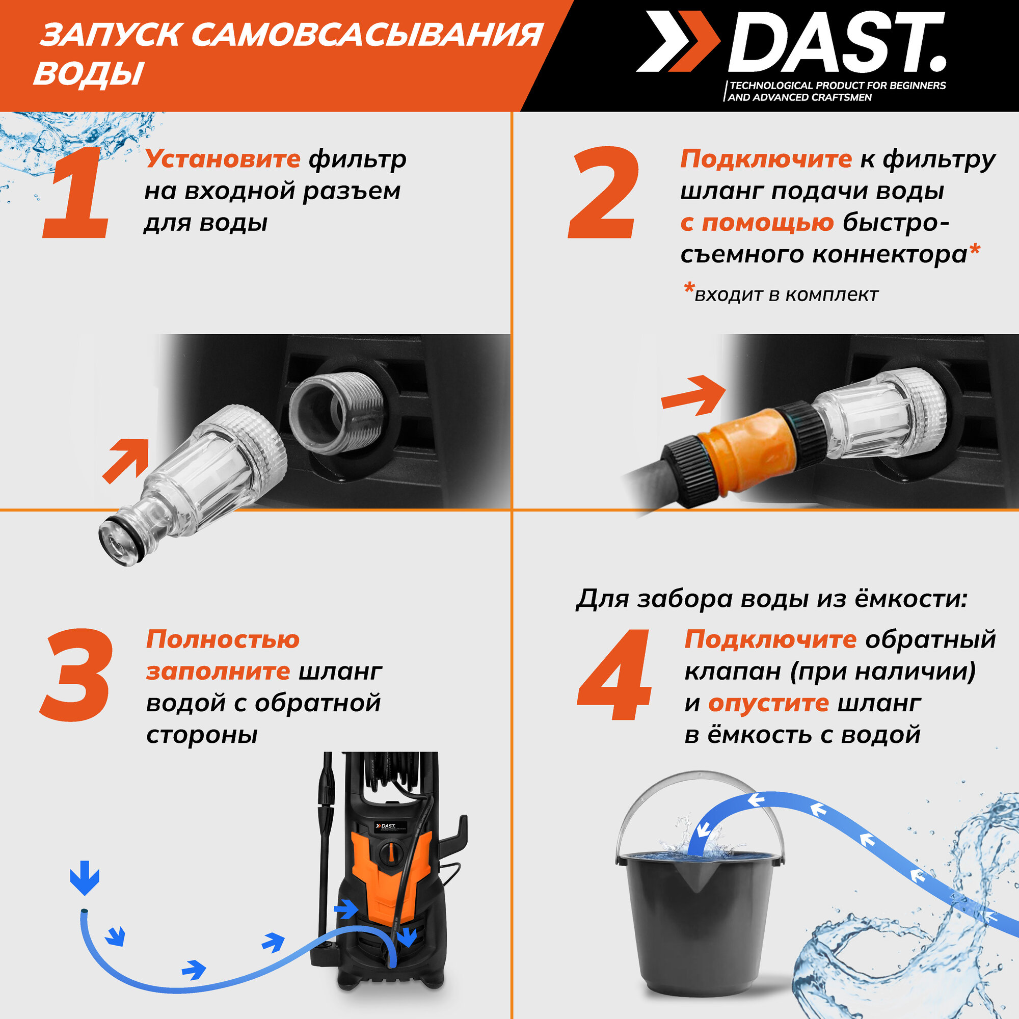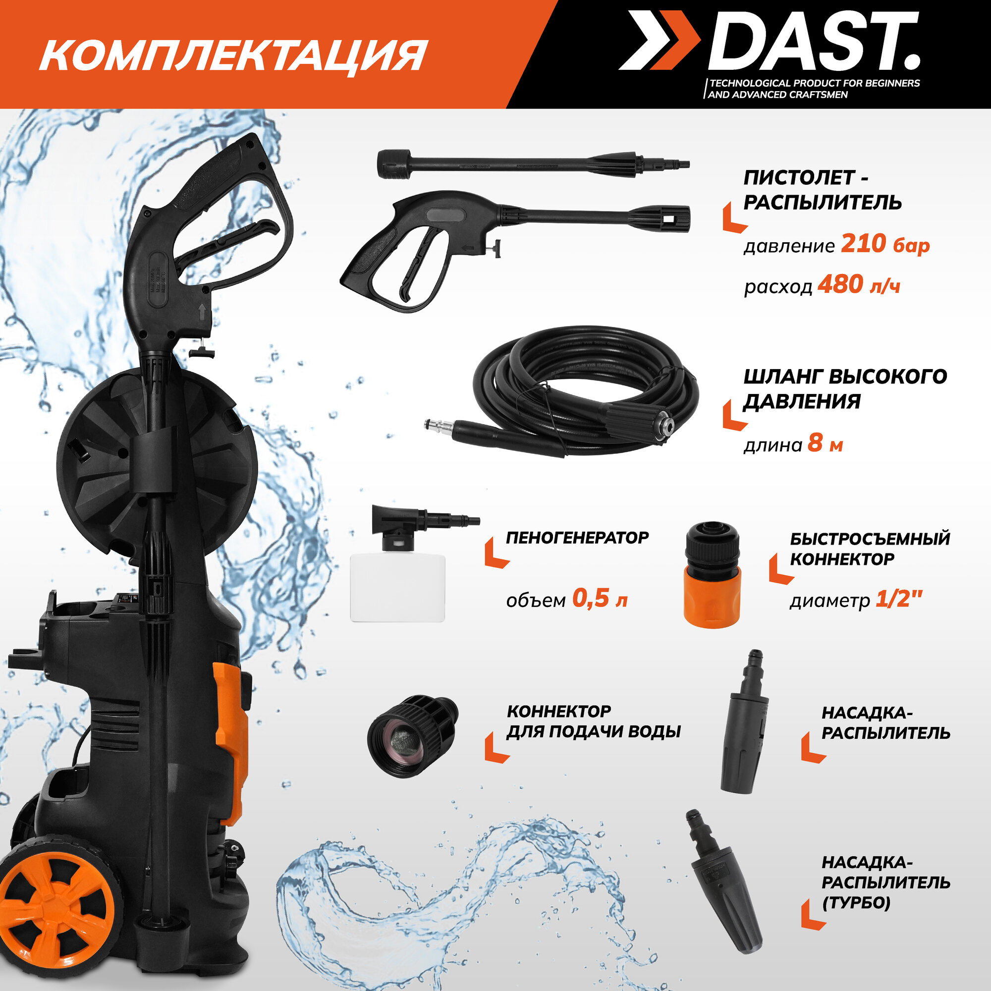 Мойка высокого давления 2500 Вт, 210 бар - 160 бар, 470 л/час, пеногенератор, шланг 8 м, кабель 5 м, DAST DMVD-2500S