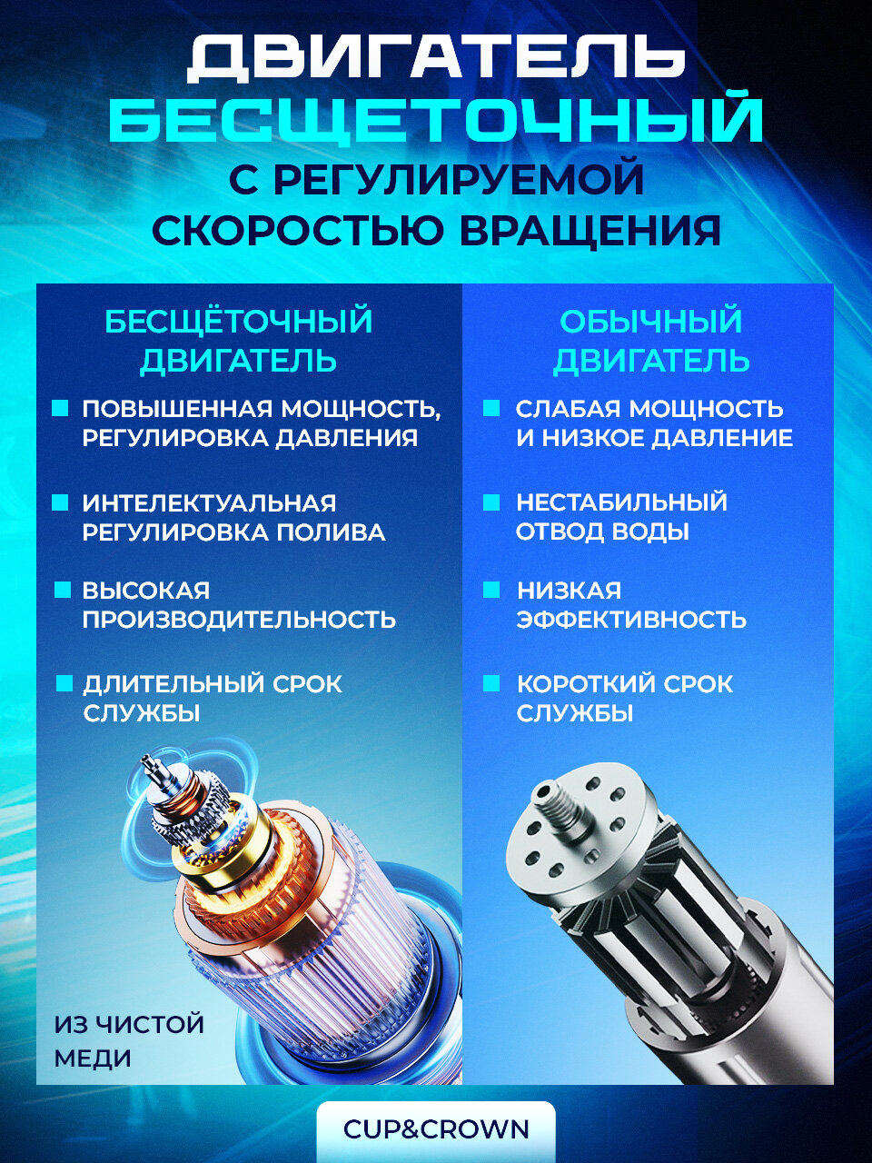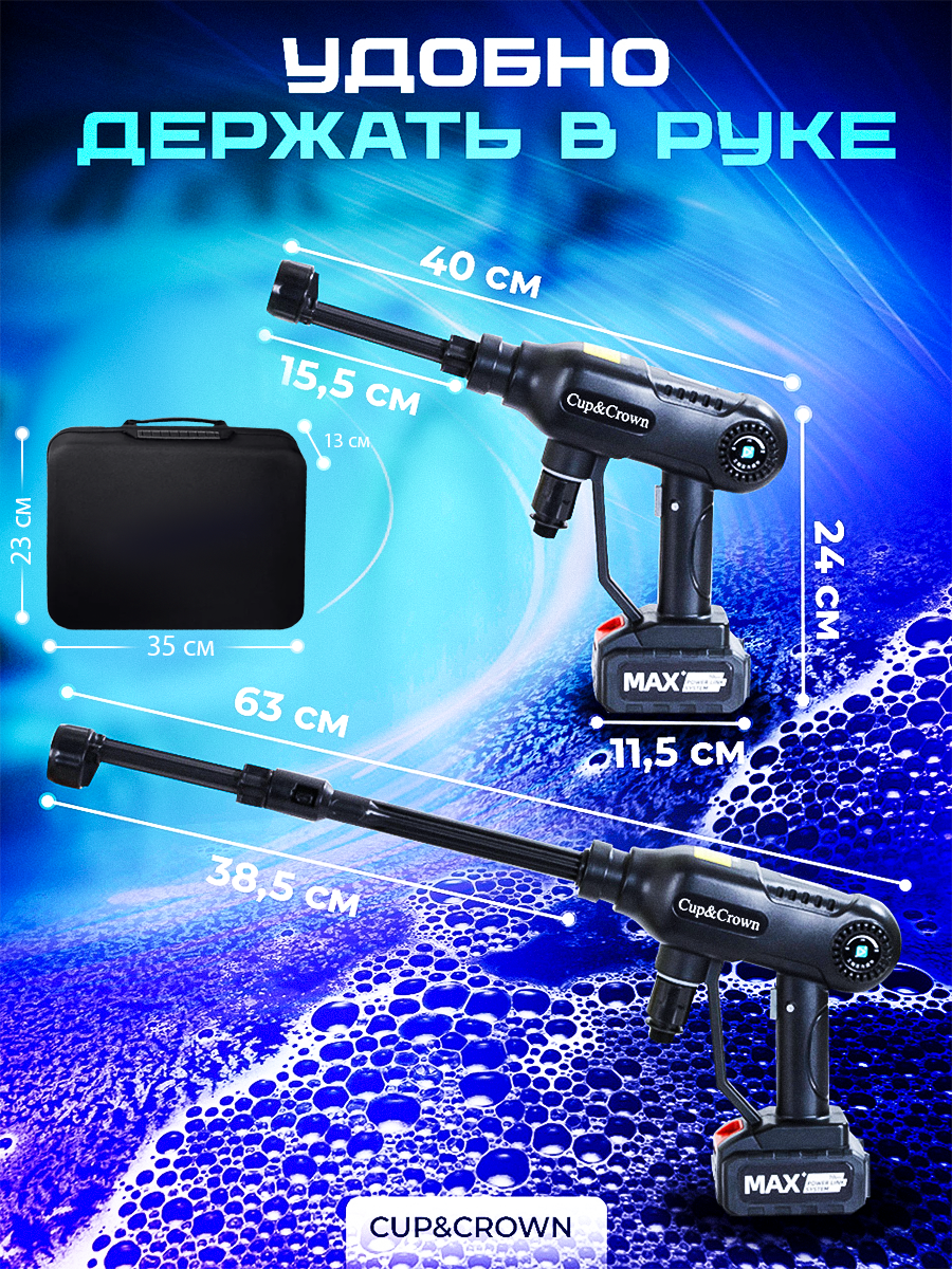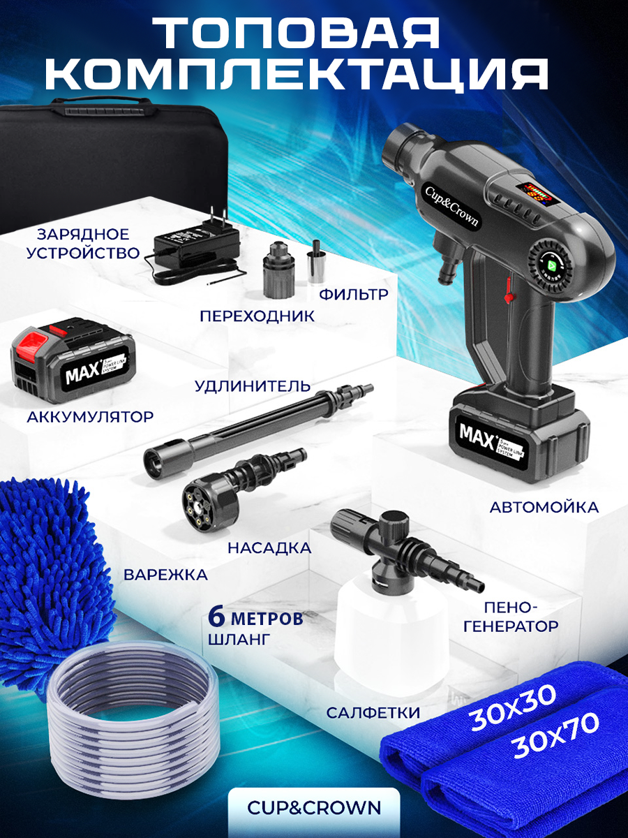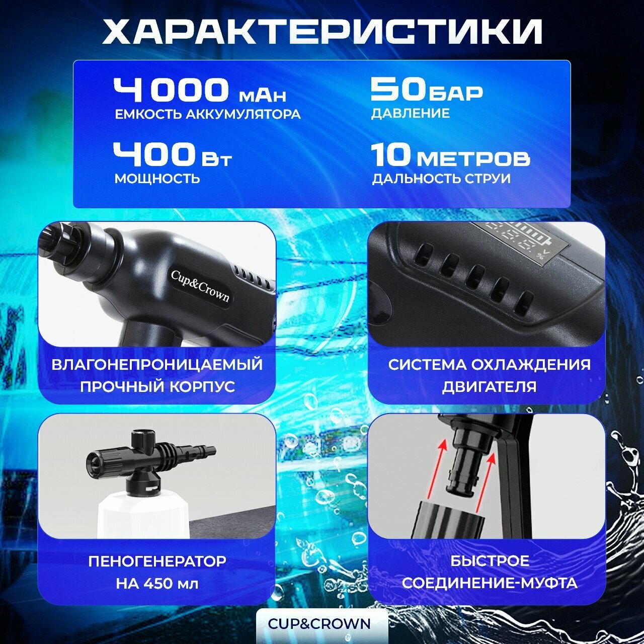 Мойка высокого давления Cup&Crown, аккумуляторная, 400Вт, 50бар, регулировка давления, черная интересное: