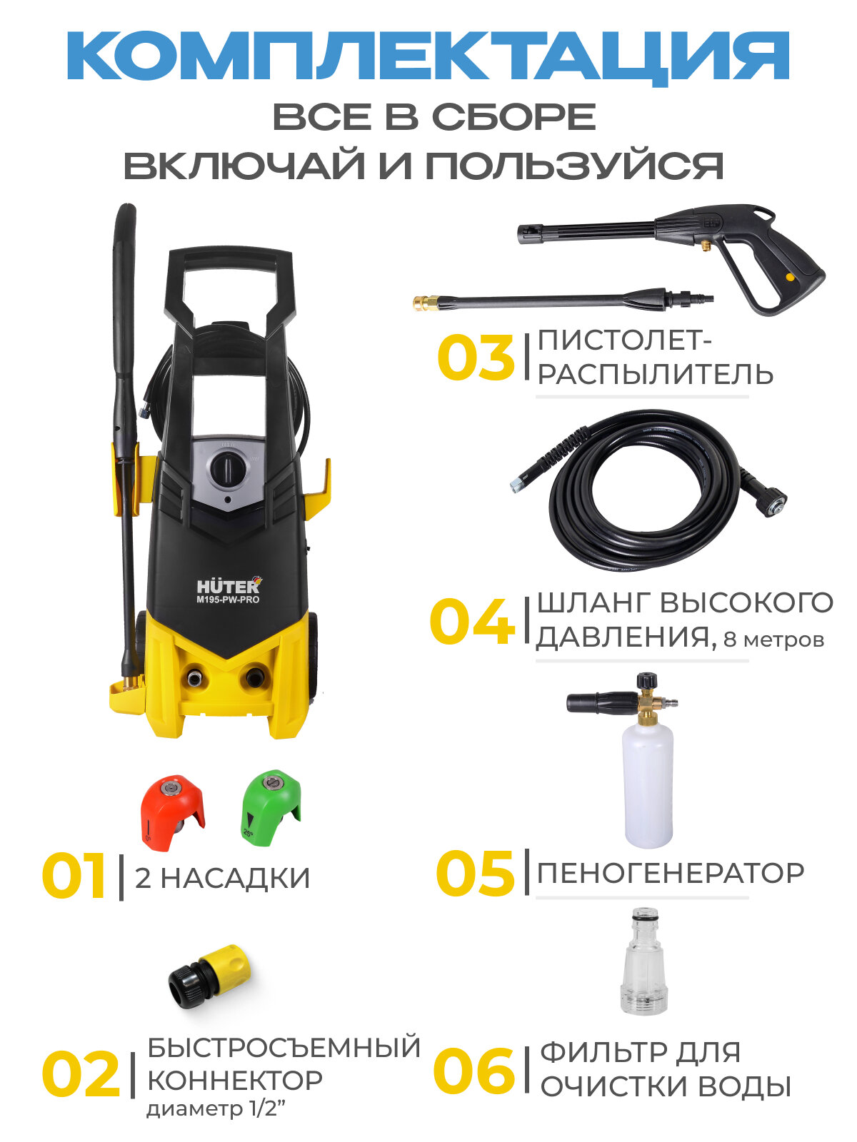 СохранитьМойка Huter M195-PW-PRO, производительность 4520 л/ч, мax давление воды 195 бар, мощность 2.5 кВт интересное: