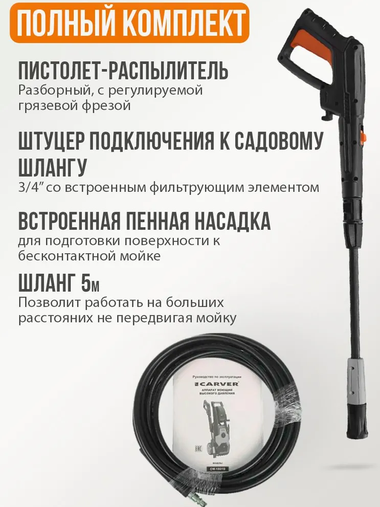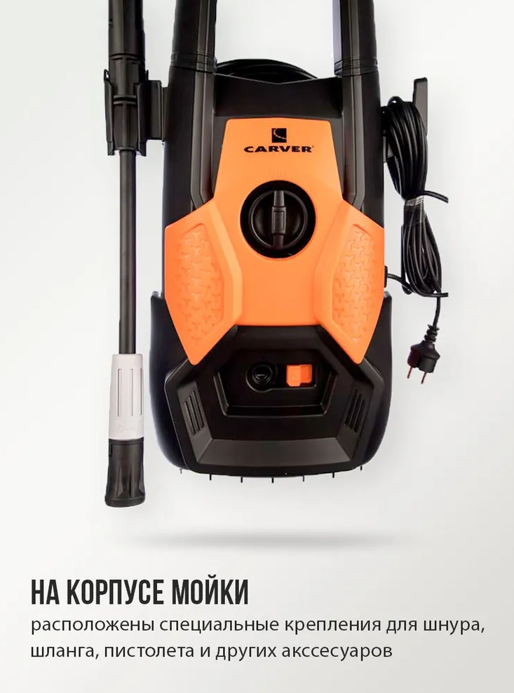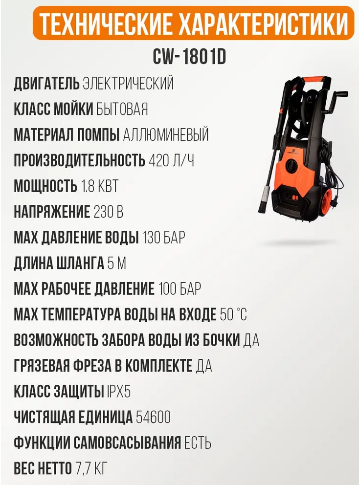 Мойка CARVER CW-1801D (1800Вт,100-130бар,6-7л/мин, алюм, шланг 5м, самовсас, колеса, катушка) 7.7кг интересное: