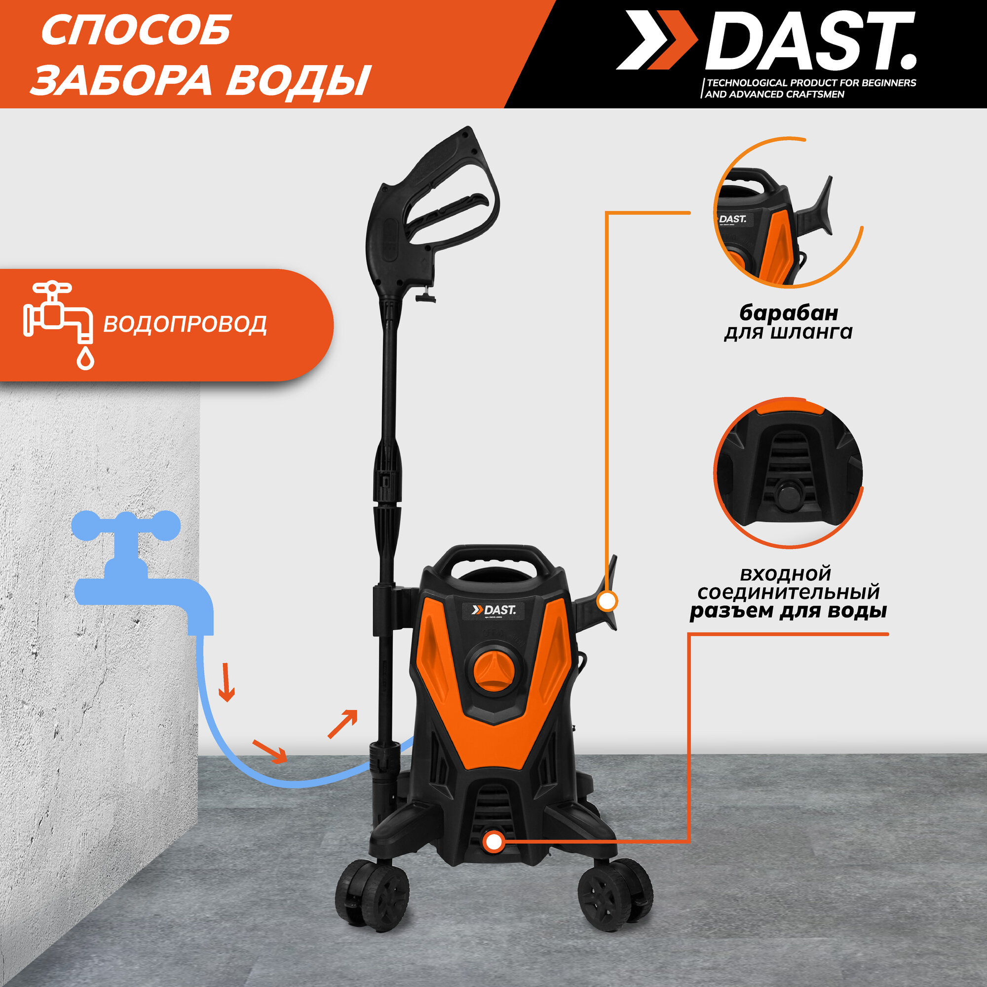 Мойка высокого давления 1800 Вт, 150 бар - 120 бар, 390 л/час, пеногенератор, шланг 5 м, шнур 3 м, DAST DMVD-1800S